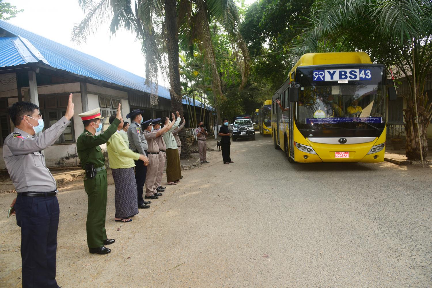ထို့နောက် ပြန်လည်လွတ်မြောက်လာသူများအား YBS ယာဉ်များဖြင့် သက်ဆိုင်ရာ မြို့နယ်အသီးသီးသို့ ပြန်လည်ပို့ဆောင်ပေးခဲ့သည်။