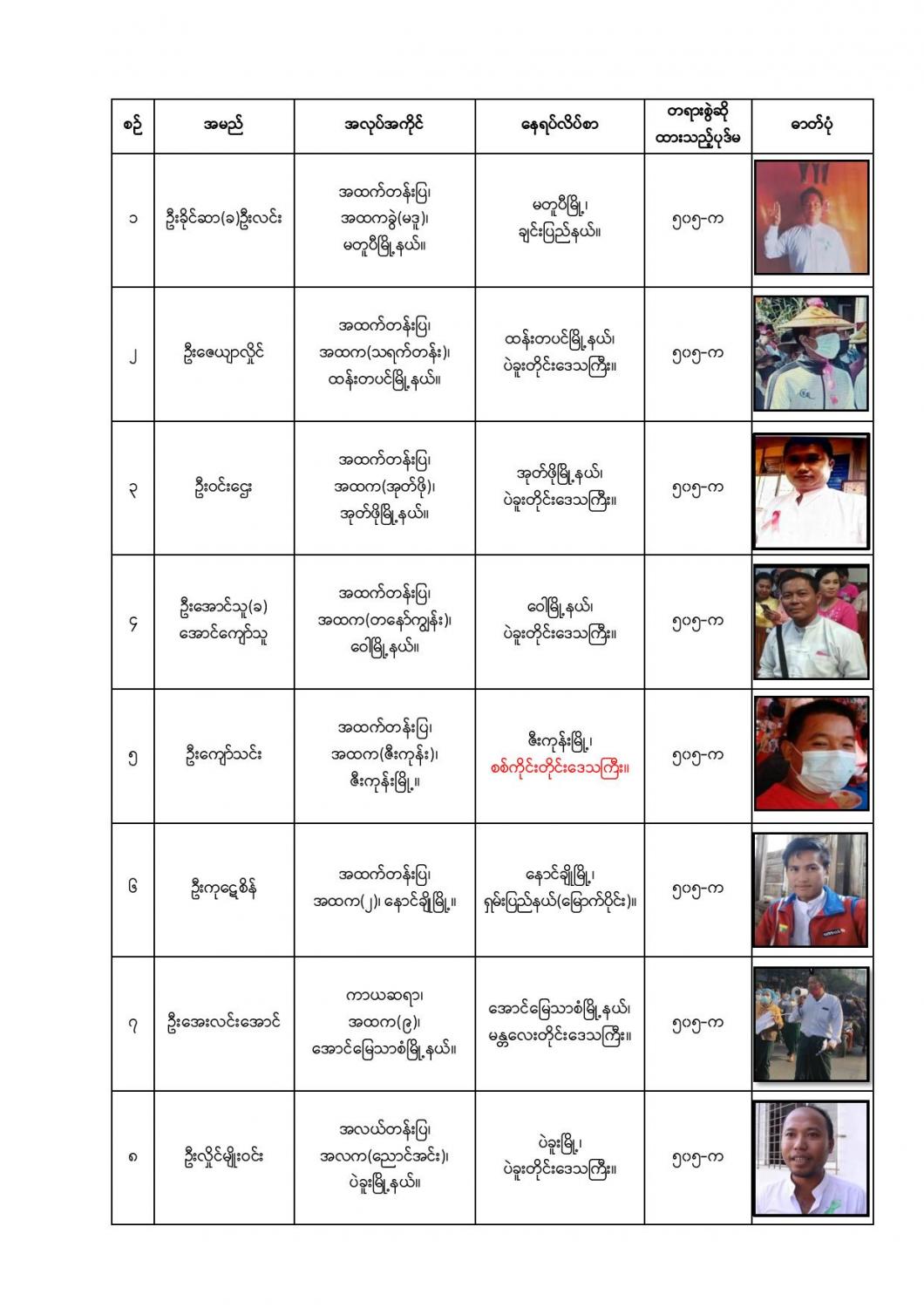အဆိုပါ အမှုဖွင့်လှစ်ထားသော ပညာရေးဝန်ထမ်းများအား ဖမ်းဆီးရမိရေး ဆောင်ရွက်လျက်ရှိပြီး ဖော်ပြပါ ပုဂ္ဂိုလ် များ နှင့်စပ်လျဉ်း၍ နီးစပ်ရာရဲစခန်းများသို့ သတင်းပေးပို့ရန်နှင့် လက်ခံထားရှိသူများအားလည်း တရား ဥပဒေအရ အရေးယူ ဆောင်ရွက်သွားမည်ဖြစ်ကြောင်း အသိပေးကြေညာအပ်ပါသည်။