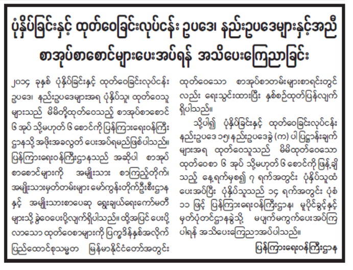 ပုံနှိပ်ခြင်းနှင့် ထုတ်ဝေခြင်းလုပ်ငန်း ဥပဒေ၊ နည်းဥပဒေများနှင့်အညီ စာအုပ်စာစောင်များ ပေးအပ်ရန် အသိပေးကြေညာခြင်း 05/05/2021