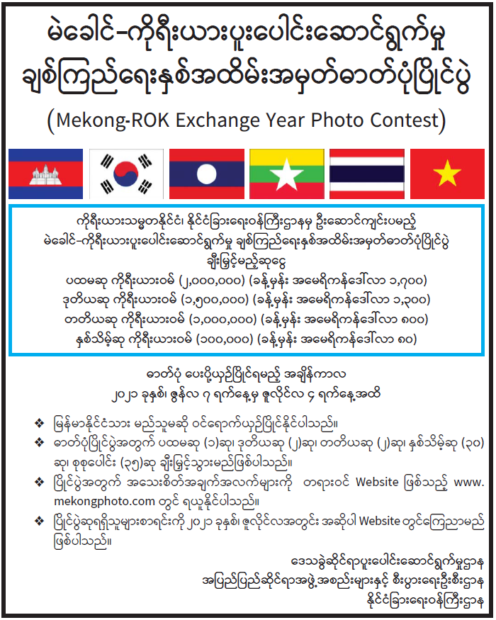 မဲခေါင်- ကိုရီးယားပူးပေါင်းဆောင်ရွက်မှု ချစ်ကြည်ရေးနှစ်အထိမ်းအမှတ်ဓာတ်ပုံပြိုင်ပွဲ