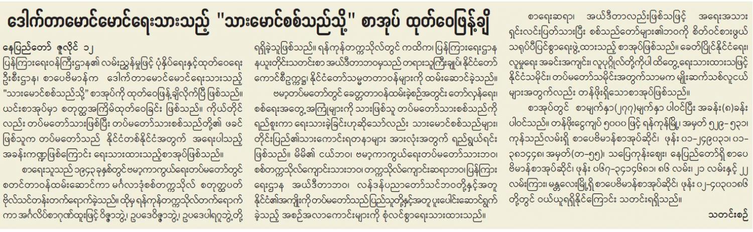 ဒေါက်တာမောင်မောင် ရေးသားသည့် "သားမောင်စစည်သည်တို့" စာအုပ် ထုတ်ဝေဖြန့်ချိ