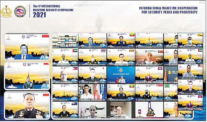 အင်ဒိုနီးရှားနိုင်ငံက အိမ်ရှင်အဖြစ် လက်ခံကျင်းပသည့် (၄) ကြိမ်မြောက် အပြည်ပြည်ဆိုင်ရာ ရေကြောင်းလုံခြုံရေး နှီးနှောဖလှယ်ပွဲ 4th International Maritime Security Symposium (2021) အခမ်းအနားကို “လုံခြုံမှု၊ ငြိမ်းချမ်းမှုနှင့် ကြွယ်ဝချမ်းသာမှုအတွက် အပြည်ပြည်ဆိုင်ရာ ရေကြောင်းလုံခြုံရေး ပူးပေါင်း ဆောင်ရွက်မှု” ခေါင်းစဉ်ဖြင့် ယနေ့တွင် Hybrid Symposium (Online and Offline) စနစ်ဖြင့် ကျင်းပခဲ့ရာ ကာကွယ်ရေးဦးစီးချုပ်(ရေ) ဗိုလ်ချုပ်ကြီး မိုးအောင် ဦးဆောင်သော တပ်မတော်(ရေ)မှ ကိုယ်စားလှယ် အရာရှိကြီးများ၊ အင်ဒိုနီးရှားနိုင်ငံ ဆိုင်ရာ မြန်မာစစ်သံမှူး(ကြည်း၊ ရေ၊ လေ)တို့ တက်ရောက်ကြသည်။