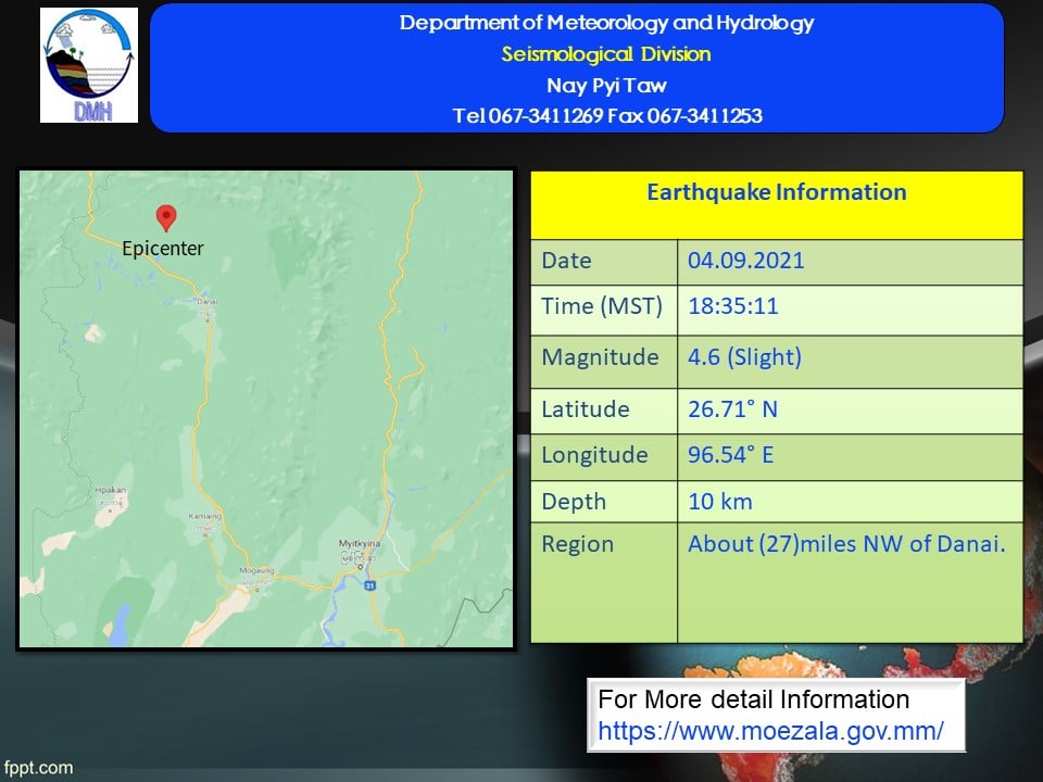 ၂၀၂၁ ခုနှစ်၊ စက်တင်ဘာလ (၄)ရက်နေ့၊ မြန်မာစံတော်ချိန် (၁၈)နာရီ၊ (၃၅)မိနစ်၊ (၁၁)စက္ကန့် အချိန်တွင် မြစ်ကြီးနားမြေငလျင်စခန်းမှ အနောက်မြောက်ဘက် မိုင်(၁၀၀) ခန့်ကွာဝေးသော မြန်မာနိုင်ငံပြည်တွင်း (တနိုင်းမြို့၏ အနောက်မြောက်ဘက် (၂၇)မိုင်ခန့်အကွာ)၊ မြောက်လတ္တီတွဒ် (၂၆.၇၁)ဒီဂရီ၊ အရှေ့လောင်ဂျီတွဒ် (၉၆.၅၄)ဒီဂရီ၊ အနက် (၁၀)ကီလိုမီတာကို ဗဟိုပြု၍ အင်အား ရစ်(ခ်)တာစကေး (၄.၆)အဆင့်ရှိ အင်အားအနည်းငယ်ရှိသော မြေငလျင်တစ်ခု လှုပ်ရှားသွားကြောင်း တိုင်းထွာရရှိပါသည်။