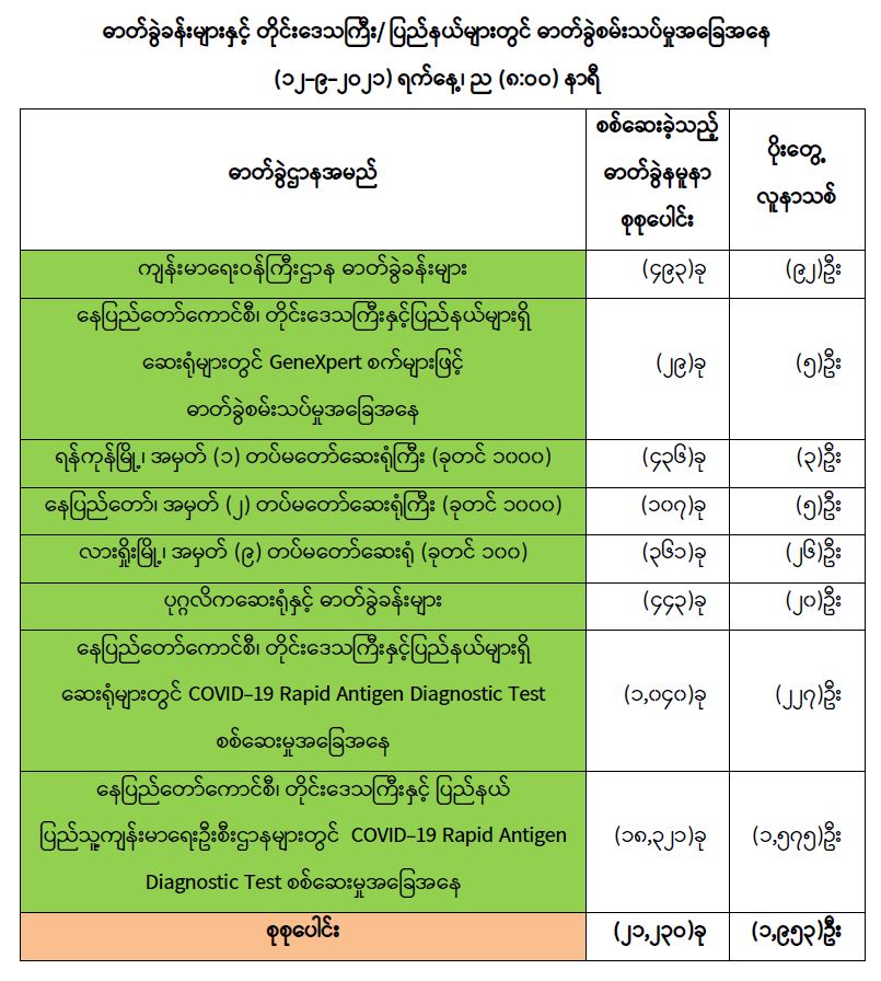 COVID-19 ရောဂါကာကွယ်ထိန်းချုပ်ရေးအတွက် တိုင်းဒေသကြီး/ပြည်နယ်များတွင် COVID-19 ရောဂါကာကွယ်ဆေးကို ဦးတည်အုပ်စုများသတ်မှတ်၍ ထိုးနှံပေးလျက်ရှိရာ (၁၁-၉-၂၀၂၁) ရက်နေ့အထိ လူဦးရေစုစုပေါင်း (၄,၉၄၄,၆၅၄) ဦးအား ထိုးနှံပေးပြီးဖြစ်၍ ကာကွယ်ဆေးနှစ် ကြိမ်အပြည့် ထိုးနှံပြီးစီးသူ (၃,၂၃၉,၇၆၄) ဦးနှင့် ပထမအကြိမ်ထိုးနှံပြီးစီးသူ (၁,၇၀၄,၈၉၀) ဦးရှိပြီဖြစ်ပါသည်။