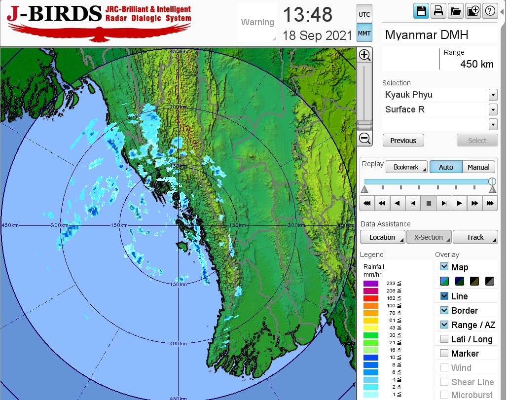 ယနေ့နံနက်(၀၉:၃၀)နာရီအချိန်ထိမိုးလေဝသတိုင်းထွာချက်အကျဉ်းချုပ်။လွန်ခဲ့သော(၂၄)နာရီအတွင်းက တနင်္သာရီတိုင်းဒေသကြီးတွင်တိမ်အသင့်အတင့် ဖြစ်ထွန်းခဲ့ပြီး၊ ကရင်ပြည်နယ်နှင့် မွန်ပြည်နယ်တို့တွင် နေရာကျဲကျဲ၊ နေပြည်တော်နှင့် ကယားပြည်နယ်တို့တွင် နေရာစိပ်စိပ်နှင့်ကျန်တိုင်းဒေသကြီးနှင့် ပြည်နယ်တို့တွင် နေရာအနှံ့အပြား မိုးထစ်ချုန်းရွာခဲ့ကာ၊ မန္တလေးတိုင်းဒေသကြီးတွင် နေရာကွက်၍ မိုးကြီးခဲ့ပါသည်။ မှတ်သားဖွယ်ရာ မိုးရေချိန်များမှာ မင်းကင်းမြို့တွင် (၂.၁၃)လက်မ၊ ညောင်ဦးမြို့တွင် (၁.၇၃)လက်မ၊ နောင်ချိုမြို့တွင် (၁.၅၇)လက်မ၊ ကျောက်တော်မြို့တွင် (၁.၄၆)လက်မ၊ စစ်တွေမြို့တွင် (၁.၄၁)လက်မ၊ မြောက်ဦးမြို့တွင် (၁.၃၀)လက်မ၊ မောင်တောမြို့တွင် (၁.၂၆)လက်မ၊ မာန်အောင်မြို့တွင် (၁.၂၂)လက်မ၊ ဆောမြို့တွင် (၁.၂၀)လက်မနှင့် မူဆယ်မြို့တွင် (၁.၁၈)လက်မတို့ ဖြစ်ကြပါသည်။