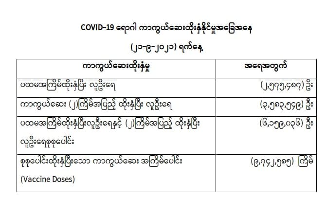 COVID-19 ရောဂါ ကာကွယ်ထိန်းချုပ်ရေးအတွက် တိုင်းဒေသကြီး/ပြည်နယ်များတွင် COVID-19 ရောဂါကာကွယ်ဆေးကို ဦးတည်အုပ်စုများသတ်မှတ်၍ ထိုးနှံပေးလျက်ရှိရာ (၂၁-၉-၂၀၂၁) ရက်နေ့ အထိ လူဦးရေစုစုပေါင်း (၆,၁၅၉,၀၃၆) ဦးအား ထိုးနှံပေးပြီးဖြစ်၍ ကာကွယ်ဆေးနှစ်ကြိမ်အပြည့် ထိုးနှံပြီးစီးသူ (၃,၅၈၃,၅၄၉) ဦးနှင့် ပထမအကြိမ်ထိုးနှံပြီးစီးသူ (၂,၅၇၅,၄၈၇) ဦးရှိပြီဖြစ်ပါသည်။ သို့ဖြစ်ပါ၍ (၂၁-၉-၂၀၂၁) ရက်နေ့အထိ မြန်မာနိုင်ငံတွင် COVID-19 ရောဂါကာကွယ်ဆေး အကြိမ် ရေ စုစုပေါင်း (၉,၇၄၂,၅၈၅) ကြိမ် ထိုးနှံပြီး ဖြစ်ပါသည်။