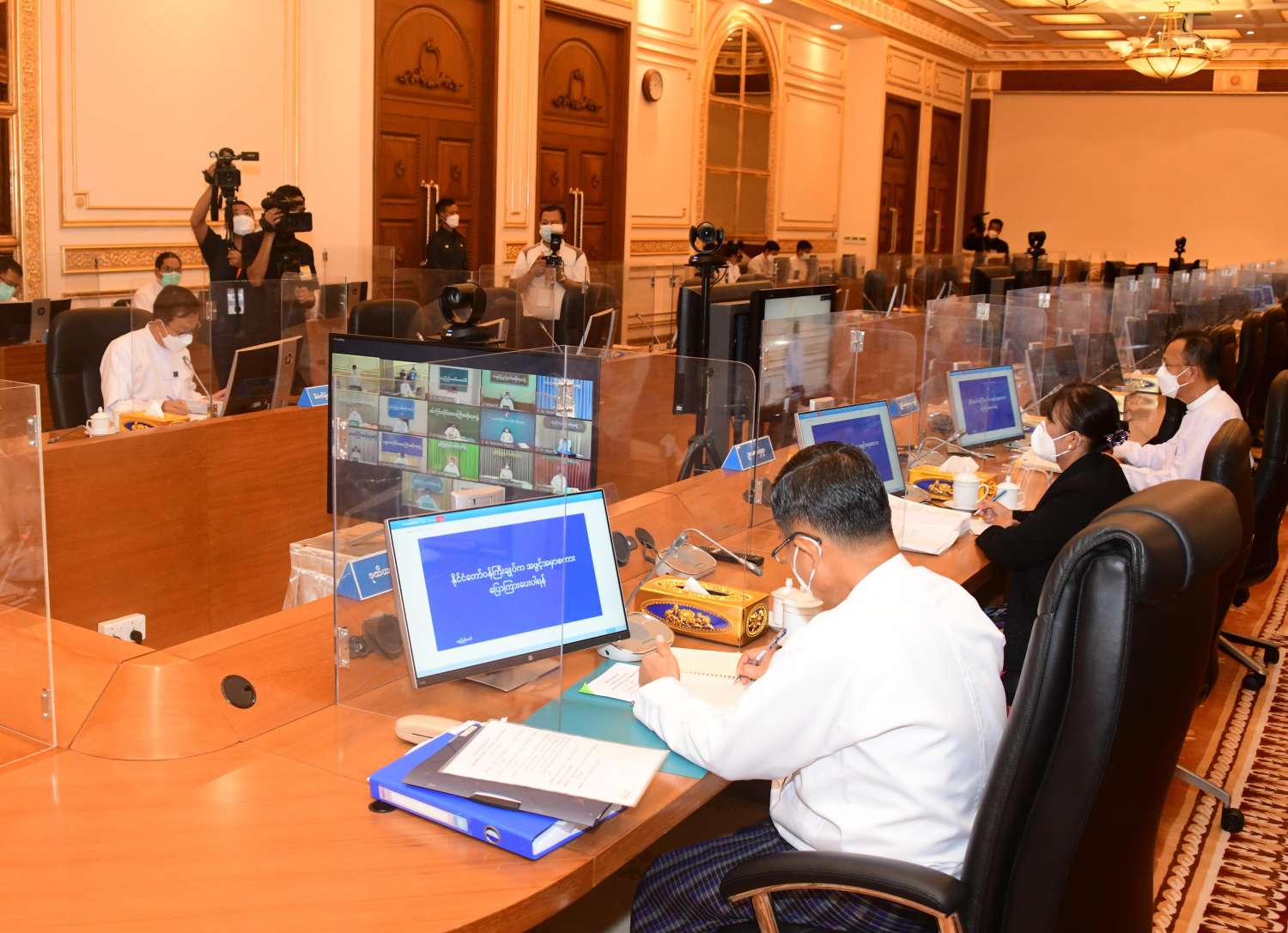 အစည်းအဝေးသို့ ဘဏ္ဍာရေးဆိုင်ရာကော်မရှင် ဒုတိယဥက္ကဋ္ဌ၊ နိုင်ငံတော်စီမံအုပ်ချုပ်ရေးကောင်စီ ဒုတိယဥက္ကဋ္ဌ၊ ဒုတိယဝန်ကြီးချုပ် ဒုတိယဗိုလ်ချုပ်မှူးကြီးစိုးဝင်း၊ ဘဏ္ဍာရေးဆိုင်ရာ ကော်မရှင် အတွင်းရေးမှူး၊ စီမံကိန်းနှင့် ဘဏ္ဍာရေးဝန်ကြီးဌာန ပြည်ထောင်စု ဝန်ကြီး ဦးဝင်းရှိန်၊ ဥပဒေရေးရာဝန်ကြီးဌာန ပြည်ထောင်စုဝန်ကြီး ဒေါက်တာဒေါ်သီတာဦး၊ ပြည်ထောင်စု စာရင်းစစ်ချုပ် ဒေါက်တာကံဇော်နှင့် ဒုတိယဝန်ကြီး ဦးမောင်မောင်ဝင်းတို့တက်ရောက်ကြပြီး တိုင်းဒေသကြီးနှင့် ပြည်နယ်အစိုးရအဖွဲ့ ဝန်ကြီးချုပ်များက Video Conferencing စနစ်ဖြင့် ချိတ်ဆက် တက်ရောက်ကြသည်။
