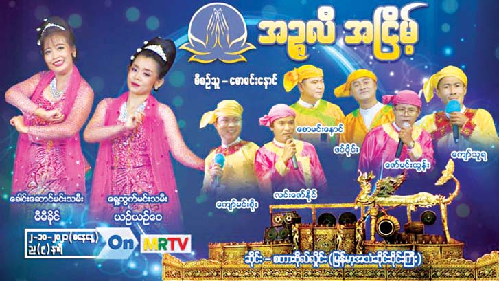 အများပြည်သူ ပျော်ရွှင်စေရန်၊ အပန်းပြေစေရန်နှင့် စိတ်ခွန်အားသစ်များ ရရှိနိုင်ရန် အတွက် မြန်မာ့အသံနှင့်ရုပ်မြင်သံကြားမှ ဖျော်ဖြေရေးအစီအစဉ်များကို တင်ဆက်လျက်ရှိ ရာ “အဥ္ဇလီအငြိမ့်” ဖျော်ဖြေပွဲကို အောက်တိုဘာ (၂)ရက်၊ စနေနေ့ ည(၈)နာရီသတင်း အပြီးတွင် မြန်မာ့အသံနှင့်ရုပ်မြင်သံကြား၏ MRTV-HD Channel မှ ထုတ်လွှင့်ပြသမည် ဖြစ်သည်။