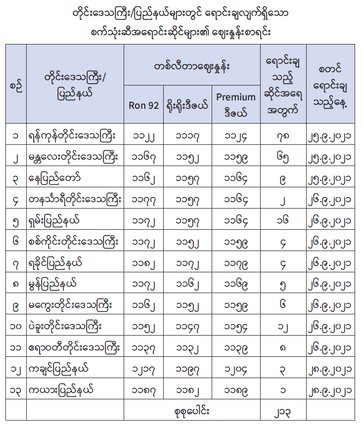 တိုင်းဒေသကြီး/ပြည်နယ်များတွင် သတ်မှတ်ဈေးနှုန်းဖြင့် ရောင်းချပေးနေသည့် စက်သုံးဆီဆိုင် လိပ်စာများကို ကြေညာခဲ့ပြီး ဖြစ်သည်။