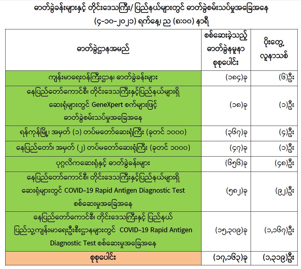 သို့ဖြစ်ပါ၍ ယနေ့အထိ ဓာတ်ခွဲနမူနာစုစုပေါင်း (၄,၃၉၃,၁၈၀)ခုအား စစ်ဆေးခဲ့ပြီး COVID-19 ဓာတ်ခွဲအတည်ပြုလူနာ စုစုပေါင်း (၄၆၉,၇၈၂) ဦး ရှိပြီ ဖြစ်ပါသည်။