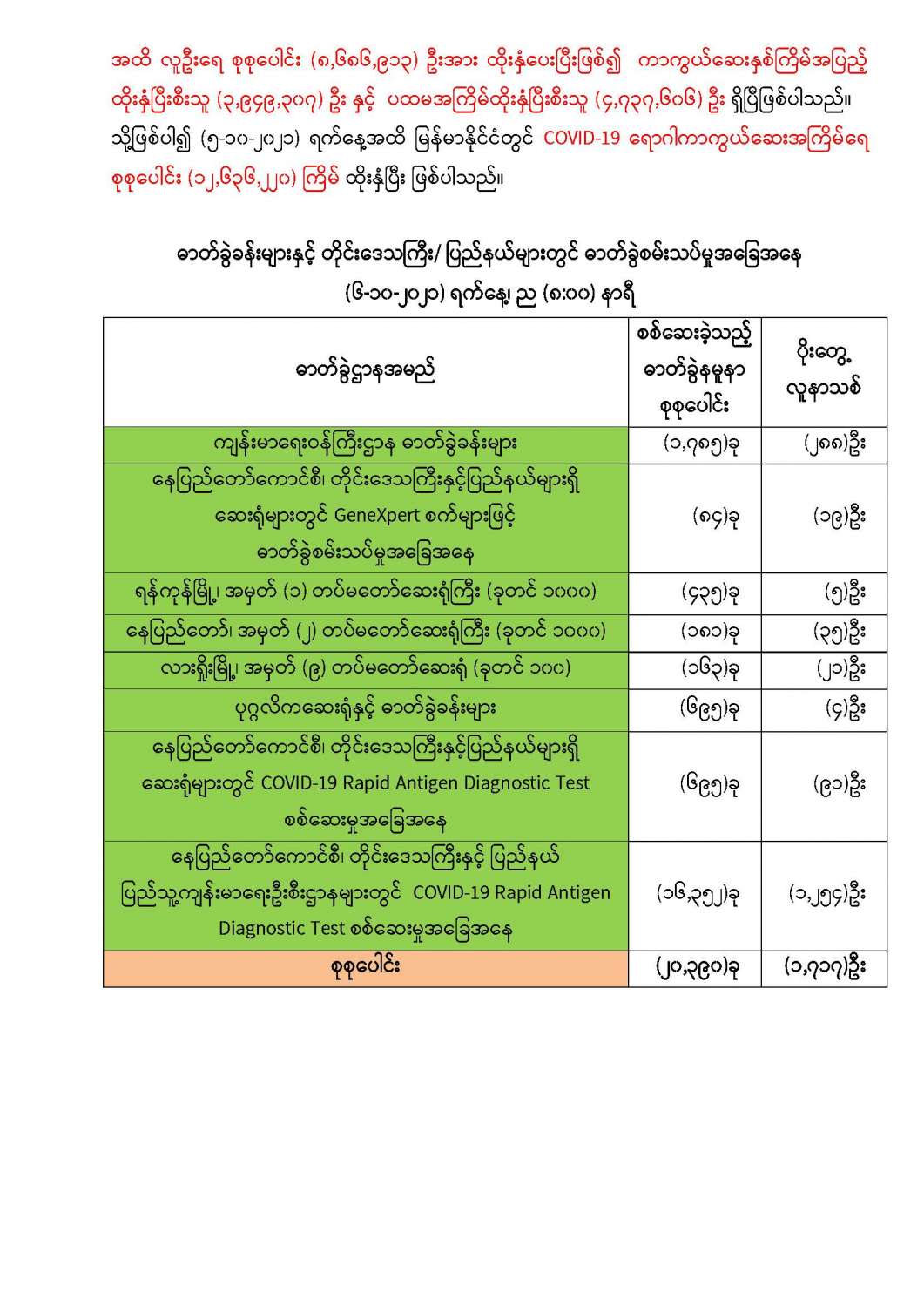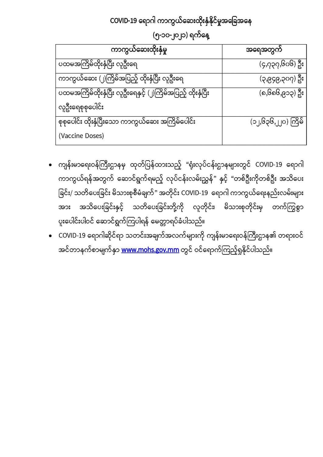 COVID-19 ရောဂါ ကာကွယ်ထိန်းချုပ်ရေးအတွက် တိုင်းဒေသကြီး/ပြည်နယ်များတွင် COVID-19 ရောဂါကာကွယ်ဆေးကို ဦးတည်အုပ်စုများသတ်မှတ်၍ ထိုးနှံပေးလျက်ရှိရာ (၅-၁၀-၂၀၂၁) ရက်နေ့ အထိ လူဦးရေစုစုပေါင်း (၈,၆၈၆,၉၁၃) ဦးအား ထိုးနှံပေးပြီးဖြစ်၍ ကာကွယ်ဆေး နှစ်ကြိမ်အပြည့် ထိုးနှံပြီးစီးသူ (၃,၉၄၉,၃၀၇) ဦး နှင့် ပထမအကြိမ်ထိုးနှံပြီးစီးသူ (၄,၇၃၇,၆၀၆) ဦးရှိပြီဖြစ်ပါသည်။