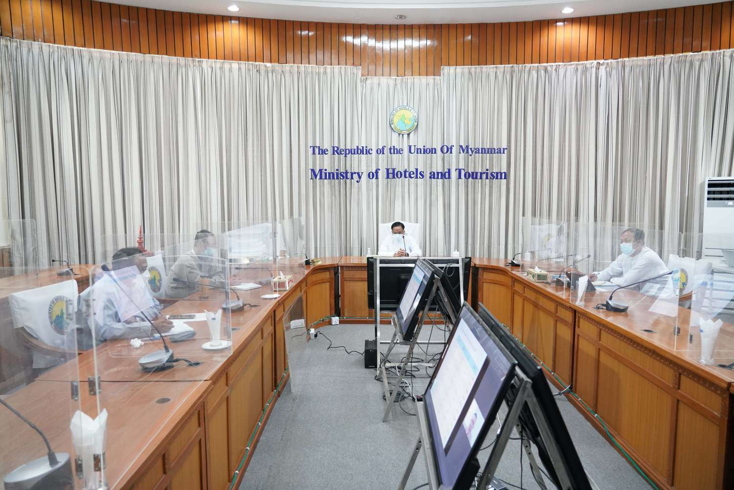 ထို့နောက် Online မှ တက်ရောက်လာကြသည့် နေပြည်တော်ကောင်စီအပါအဝင် တိုင်း ဒေသကြီး/ ပြည်နယ် ရုံးခွဲတာဝန်ခံများနှင့် ဟိုတယ်ဇုန် ဥက္ကဋ္ဌများက ဟိုတယ်များ ဖွင့်လှစ် ထားရှိမှုနှင့် ခရီးစဉ်ဒေသအခြေအနေ၊ ဟိုတယ်နှင့်ခရီးသွားလုပ်ငန်းဆိုင်ရာ နယ်ပယ် (၇) မျိုးတွင် လုပ်ကိုင် ဆောင်ရွက်နေသူများအား ကိုဗစ်-၁၉ ကာကွယ်ဆေး ထိုးနှံပြီးစီးမှု အခြေအနေ၊ Online မှ Outsoursing သင်တန်းများဖွင့်လှစ်ထားရှိမှု၊ ခရီးစဉ်ဒေသ အသစ်များ ဖော်ဆောင် နေမှုများကို ဆွေးနွေးတင်ပြကြရာ ပြည်ထောင်စုဝန်ကြီးက ဝန်ထမ်းများ ကိုဗစ်-၁၉ ကာကွယ် ဆေးအပြည့် အဝထိုးနှံနိုင်ရေး၊ Online သင်တန်းများကို ဟိုတယ်နှင့်ခရီးသွားလုပ်ငန်းမှ ဝန်ထမ်းများ ထိထိ ရောက်ရောက် ပါဝင်တက်ရောက်ပြီး လက်တွေ့ဝန် ဆောင်မှုပေးနိုင်အောင် ဆောင်ရွက် ကြရေး၊ ခရီးစဉ်ဒေသအသစ်များနှင့် ခရီးသွားဆွဲဆောင်မှုအသစ်များ စနစ်တကျ ဖော်ထုတ်ရေးတို့ကို မှာ ကြားပြီး လိုအပ်သည်များကို ပေါင်းစပ်ညှိနှိုင်း ဆောင်ရွက်ပေးခဲ့ကြောင်း သိရသည်။
