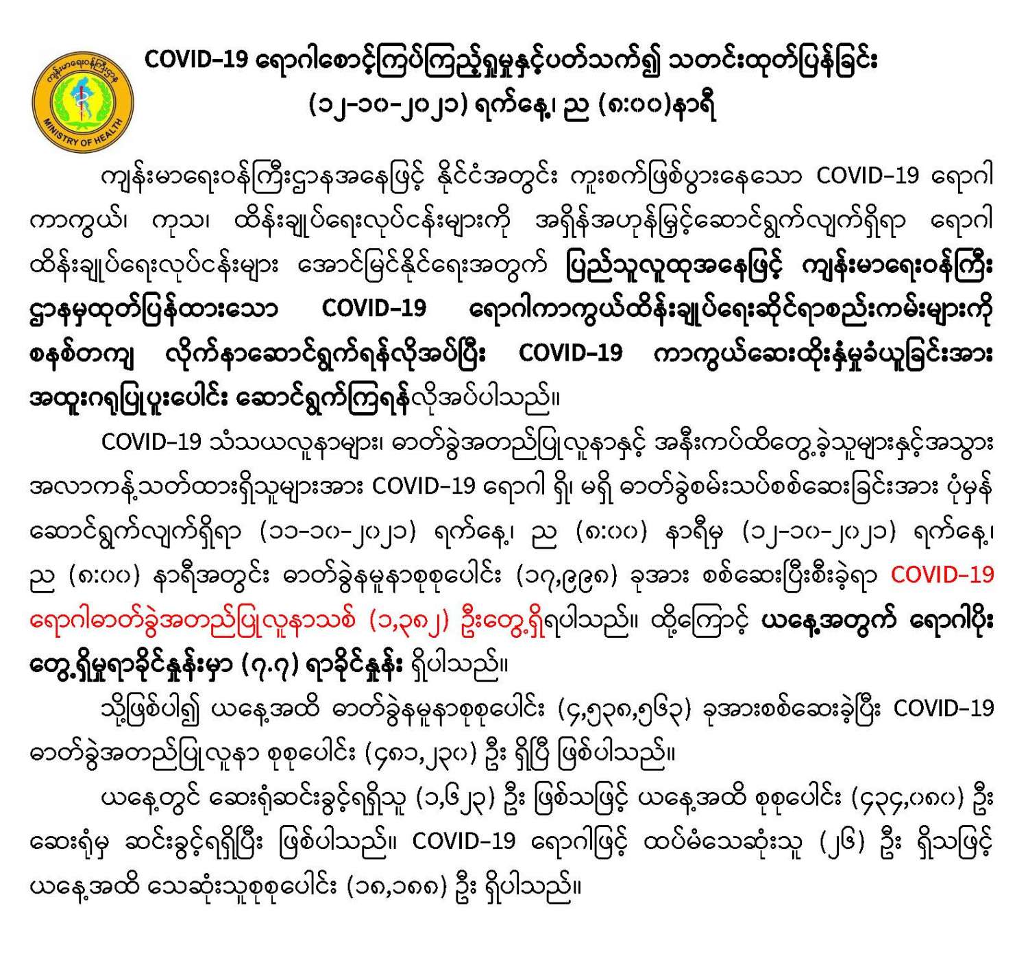 COVID-19 ရောဂါစောင့်ကြပ်ကြည့်ရှုမှုနှင့်ပတ်သက်၍ သတင်းထုတ်ပြန်ခြင်း (၁၂-၁၀-၂၀၂၁) ရက်နေ့၊ ည (၈:၀၀)နာရီ 10/12/2021 COVID-19 ရောဂါစောင့်ကြပ်ကြည့်ရှုမှုနှင့်ပတ်သက်၍ သတင်းထုတ်ပြန်ခြင်း (၁၂-၁၀-၂၀၂၁) ရက်နေ့၊ ည (၈:၀၀)နာရီ