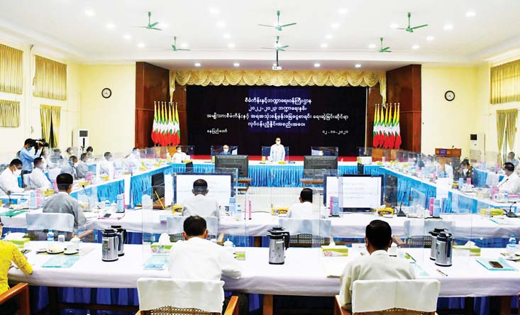 အစည်းအဝေးတွင် စီမံကိန်း နှင့် ဘဏ္ဍာရေးဝန်ကြီးဌာန ပြည်ထောင်စုဝန်ကြီး ဦးဝင်းရှိန် က ၂၀၂၂-၂၀၁၃ ဘဏ္ဍာရေးနှစ်၊ အမျိုးသားစီမံကိန်းနှင့်အရအသုံး ခန့်မှန်းခြေငွေစာရင်း ရေးဆွဲနိုင် ရေးအတွက် အခြေခံမည့် အမျိုးသားစီမံကိန်း၊ (၂၀၂-၂၀၁၃ ဘဏ္ဍာရေးနှစ်မှ ၂၀၂၆-၂၀၂၇ ဘဏ္ဍာရေးနှစ်အထိ) (၅) နှစ် စီမံကိန်းကို ချမှတ်ရေးဆွဲဆောင် ရွက်သွားမည်ဖြစ်ကြောင်း၊ ယခင် နှစ်ရှည်စီမံကိန်းများ ဖြစ်သည့် အမျိုးသားဘက်စုံ ဖွံ့ဖြိုးတိုးတက်မှုစီမံကိန်း (National Comprehensive Development PlanNCDP) နှင့် မြန်မာနိုင်ငံ၏ ရေရှည် တည်တံ့ခိုင်မြဲပြီး ဟန်ချက်ညီသော ဖွံ့ဖြိုးတိုးတက်မှုစီမံကိန်း (Myanmar Sustainable Development Plan - MSDP) တို့ကို ပြန်လည်သုံးသပ်၍ နိုင်ငံ တော် စီမံအုပ်ချုပ်ရေးကောင်စီ၏ ရှေ့လုပ်ငန်းစဉ် (၅) ရပ်၊ ဦးတည် ချက် (၉) ရပ်တို့ကို အခြေခံမူများ ထားရှိပြီး နိုင်ငံတကာနှင့် ဒေသတွင်း ကတိကဝတ်များနှင့် ချိတ်ဆက်ကာ (၅)နှစ် စီမံကိန်း၏ ရည်မှန်းချက်နှင့် ဆောင်ရွက်မည့် အစီအစဉ်များ ရေးဆွဲသွားမည် ဖြစ်ကြောင်းနှင့် ၂၀၂၂-၂၀၂၃ ဘဏ္ဍာရေးနှစ်တွင် အကောင်အထည်ဖော် ဆောင်ရွက်မည့် လုပ်ငန်းစီမံကိန်းများအား ကြိုတင်စိစစ်ဆောင်ရွက်သွားမည့် အစီအစဉ်များနှင့် ပတ်သက်၍ လည်းကောင်း၊ အရအသုံးခန့်မှန်း ခြေ ငွေစာရင်းရေးဆွဲရာတွင် နိုင်ငံတော်၏ လိုငွေထိန်းနိုင်ရေးနှင့် ရေရှည်တည်တံ့သည့် ဘတ်ဂျက်သုံးစွဲမှုပုံစံ ဖြစ်စေရေး အတွက် သာမန်နှင့်ငွေလုံးငွေရင်း စာရင်းများရေးဆွဲရာတွင်လိုက်နာ ရမည့် ကိစ္စရပ်များနှင့် စပ်လျဉ်း၍ လည်းကောင်း ရှင်းလင်းဆွေးနွေးသည်။