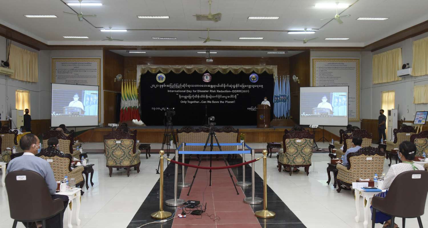 ၂၀၂၁ ခုနှစ် အပြည်ပြည်ဆိုင်ရာ သဘာ၀ဘေးအန္တရာယ် ထိခိုက်ဆုံးရှုံးနိုင်ခြေ လျှော့ချရေးနေ့ အထိမ်းအမှတ်အခမ်းအနားကို ယနေ့နံနက် ၉ နာရီခွဲတွင် နေပြည်တော်ရှိ လူမှုဝန်ထမ်း၊ ကယ်ဆယ်ရေးနှင့် ပြန်လည်နေရာချထားရေးဝန်ကြီးဌာန အစည်းအဝေးခန်းမ၌ ကျင်းပရာ အမျိုးသားသဘာ၀ဘေး အန္တရာယ်ဆိုင်ရာ စီမံခန့်ခွဲမှုကော်မတီ ဥက္ကဋ္ဌ၊ နိုင်ငံတော်စီမံအုပ်ချုပ်ရေးကောင်စီ ဒုတိယဥက္ကဋ္ဌ၊ ဒုတိယဝန်ကြီးချုပ် ဒုတိယဗိုလ်ချုပ်မှူးကြီးစိုးဝင်း တက်ရောက်အမှာစကား ပြောကြားသည်။