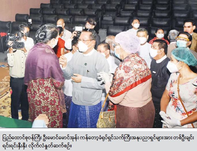 ရှေးဦးစွာ နိုင်ငံတော်စီမံအုပ်ချုပ်ရေးကောင်စီ က လှူဒါန်းသည့် အလှူငွေကျပ် သိန်း ၁၀၀ ကို နိုင်ငံတော်စီမံအုပ်ချုပ်ရေးကောင်စီ ကိုယ်စား ပြည်ထောင်စုဝန်ကြီး ဦးမောင်မောင်အုန်း က လည်းကောင်း၊ ပြန်ကြားရေးဝန်ကြီးဌာနက လှူဒါန်းသည့် အလှူငွေကျပ်သိန်း ၁၀၀ ကို ပြန်ကြားရေးနှင့် ပြည်သူ့ဆက်ဆံရေးဦးစီးဌာန ညွှန်ကြားရေးမှူးချုပ် ဦးအေးကြွယ်က လည်းကောင်း၊ Forever Group နှင့် ရွှေသံလွင်ကုမ္ပဏီတို့က လှူဒါန်းသည့် အလှူငွေ နှင့်ပစ္စည်းများကို တာဝန်ရှိသူများက လည်းကောင်း၊ တစ်မိုးအောက် မြန်မာလူမှုကယ်ဆယ်ရေးအဖွဲ့က လှူဒါန်းသည့် Oxygen Concentrator ၁၀ လုံးကို အကယ်ဒမီ ရန်အောင်က လည်းကောင်း ပေးအပ်လှူဒါန်းရာ မြန်မာနိုင်ငံရုပ်ရှင်အစည်းအရုံးမှ တာဝန် ရှိသူများက လက်ခံကြသည်။