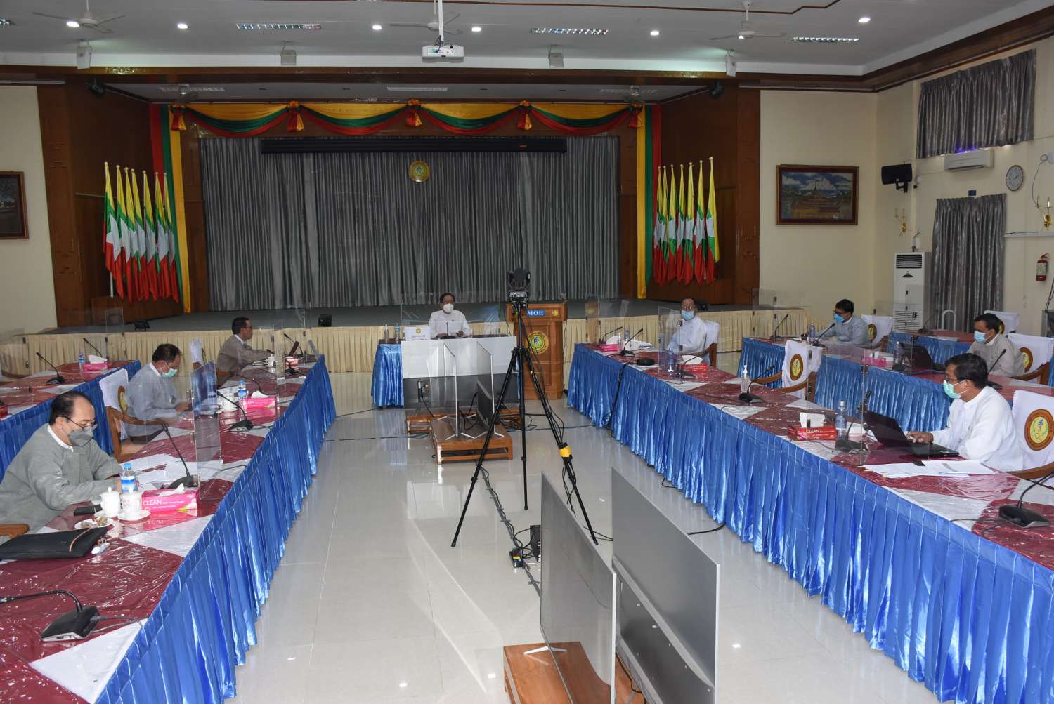 ကိုဗစ်-၁၉ ရောဂါ ကာကွယ်ထိန်းချုပ်ရေး လုပ်ငန်းညှိနှိုင်းအစည်းအဝေးကို ယမန်နေ့ မွန်းလွဲ ၁ နာရီက ကျန်းမာရေးဝန်ကြီးဌာန အစည်းအဝေးခန်းမ၌ ဗွီဒီယိုကွန်ဖရင့်စနစ်ဖြင့် ကျင်းပသည်။