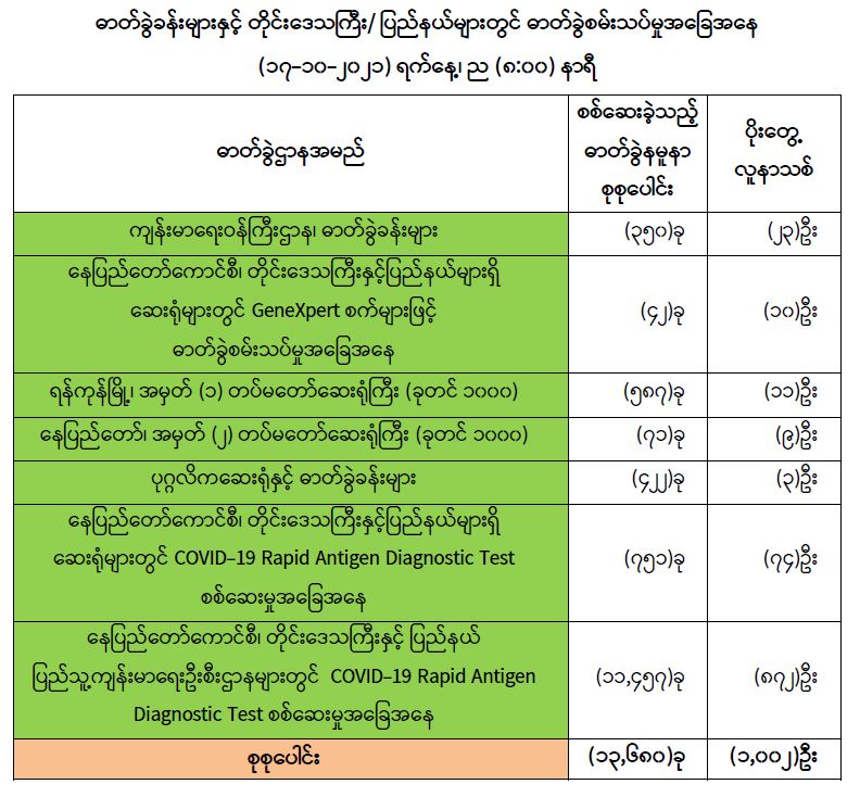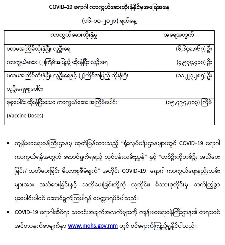 COVID-19 ရောဂါ ကာကွယ်ထိန်းချုပ်ရေးအတွက် တိုင်းဒေသကြီး/ပြည်နယ်များတွင် COVID-19 ရောဂါကာကွယ်ဆေးကို ဦးတည်အုပ်စုများသတ်မှတ်၍ ထိုးနှံပေးလျက်ရှိရာ (၁၆-၁၀-၂၀၂၁) ရက်နေ့ အထိ လူဦးရေ စုစုပေါင်း (၁၁,၂၂၃,၂၈၅) ဦးအား ထိုးနှံပေးပြီးဖြစ်၍ ကာကွယ်ဆေးနှစ်ကြိမ်အပြည့် ထိုးနှံပြီးစီးသူ (,၅၇၄,၄၁၈) ဦး နှင့် ပထမအကြိမ်ထိုးနှံပြီးစီးသူ (,၆၄၈,၈၆၇) ဦး ရှိပြီဖြစ်ပါသည်။ သို့ဖြစ်ပါ၍ (၁၆-၁၀-၂၀၂၁) ရက်နေ့အထိ မြန်မာနိုင်ငံတွင် COVID-19 ရောဂါကာကွယ်ဆေး အကြိမ်ရေ စုစုပေါင်း (၁၅,၇၉၇,၇၀၃) ကြိမ် ထိုးနှံပြီး ဖြစ်ပါသည်။