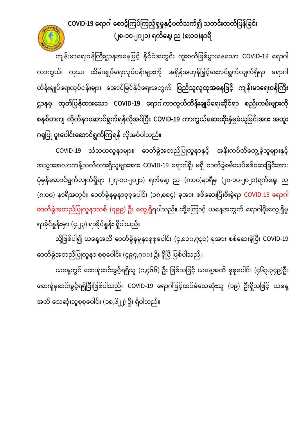 COVID-19 ရောဂါ စောင့်ကြပ်ကြည့်ရှုမှုနှင့်ပတ်သက်၍ သတင်းထုတ်ပြန်ခြင်း (၂၈-၁၀-၂၀၂၁) ရက်နေ့၊ ည (၈:၀၀)နာရီ 10/28/2021