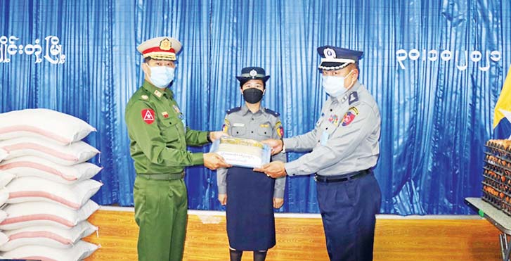 ထိုသို့ ပေးအပ်လျက်ရှိရာ ယနေ့တွင် ရှမ်းပြည်နယ် (အရှေ့ပိုင်း) ကျိုင်းတုံမြို့ရှိ မြန်မာ နိုင်ငံ ရဲတပ်ဖွဲ့ဝင်များ၊ မီးသတ် တပ်ဖွဲ့ဝင်များနှင့် ပရဟိတအဖွဲ့ များအတွက် ဆန်၊ ဆီ၊ ဆား၊ ပဲ အမယ် လေးမျိုးနှင့် စားသောက် ဖွယ်ရာများကို တြိဂံဒေသတိုင်း စစ်ဌာနချုပ်တိုင်းမှူး ဗိုလ်မှူးချုပ် မျိုးမင်းထွန်းနှင့် တာဝန်ရှိသူများက ကျိုင်းတုံမြို့ရှိ ပြည်နယ် ဒုတိယရဲတပ်ဖွဲ့မှူးရုံး၌ လည်းကောင်း၊ မွန်ပြည်နယ် မုဒုံမြို့နယ်ရှိ စစ်မှုထမ်းဟောင်း အဖွဲ့ဝင်များအတွက် အရှေ့တောင် တိုင်းစစ်ဌာနချုပ်မှ တာဝန်ရှိသူ များက မုဒုံမြို့နယ်ရှိ စစ်မှု ထမ်းဟောင်းအဖွဲ့ရုံး၌ လည်းကောင်း အသီးသီးထောက်ပံ့ ပေးအပ်ခဲ့ကြောင်း သတင်းရရှိသည်။