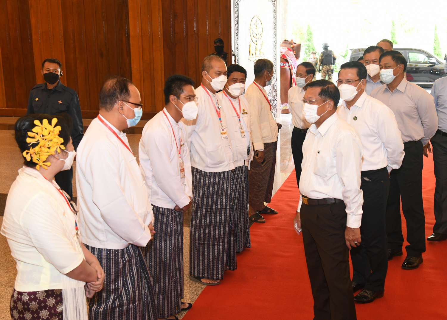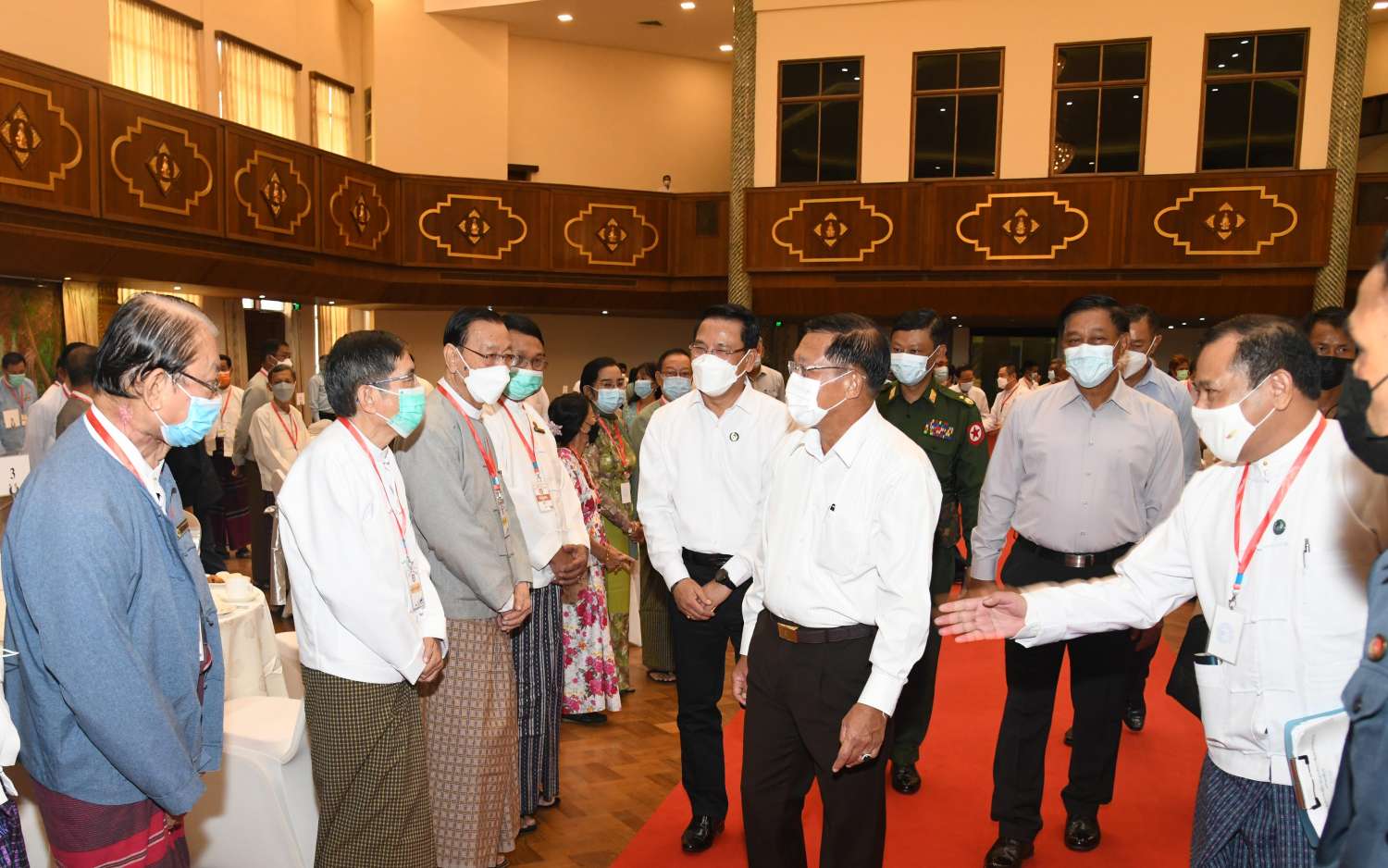 ကိုဗစ်-၁၉ ရောဂါဖြစ်ပွားချိန်တွင် မိမိတို့နိုင်ငံ၏ အဓိကအခက်အခဲမှာ ပစ္စည်းများ စုံလင်မှုမရှိခြင်းနှင့် ဆေးဝါးပစ္စည်းများ စုံလင်မှုမရှိခြင်း၊ လူသားအရင်းအမြစ် နည်းပါးခြင်းတို့ကြောင့် အကြပ်အတည်းများ ဖြစ်ပေါ်ခဲ့ကြောင်း၊ မိမိတို့နိုင်ငံသည့် လှူတန်းလိုစိတ်ရှိသူများ ပေါများခြင်းတို့ကြောင့် အခက်အခဲ ဖြစ်ပေါ်ချိန်တွင် အားလုံး ဝိုင်းဝန်းဆောင်ရွက်ခဲ့ကြသကဲ့သို့ မိတ်ဆွေနိုင်ငံများမှလည်း ကူညီခဲ့ကြမှုများရှိခဲ့ ကြောင်း၊ ယခုအခါ ကိုဗစ်-၁၉ ရောဂါဖြစ်ပွားမှုများ ကျဆင်းသွားပြီဖြစ်ကြောင်း၊ ကျန်ရှိသည့် ရောဂါ ဖြစ်ပွားမှုနှုန်းမြင့်တက်လျက်ရှိသည့် ဒေသများတွင်လည်း ကူးစက်မှုနှုန်းကျဆင်းရေး အလေးထား ဆောင်ရွက်လျက်ရှိကြောင်း၊ ကိုဗစ်ကြောင့် တုံ့ဆိုင်းခဲ့ရသည့် နိုင်ငံ့ယန္တရားများ ပြန်လည် လည်ပတ်နိုင်ရေး အတွက်လည်း အနုပညာရှင်များ အနေဖြင့် ဝိုင်းဝန်းကူညီပါဝင် ဆောင်ရွက်ကြစေလိုကြောင်း၊ မိမိတို့အနေဖြင့် တပ်မတော်မှ ပေးအပ်ထားသည့် ကတိအတိုင်း ရှေ့လုပ်ငန်းစဉ်များနှင့် ဦးတည်ချက် များချမှတ်၍ ဆောင်ရွက်လျက်ရှိကြောင်း၊ ရှေ့လုပ်ငန်းစဉ်များအား အကောင်အထည်ဖော် ဆောင်ရွက်ပြီးချိန်တွင် မိမိတို့နိုင်ငံ၏ လမ်းကြောင်းအား ပြန်လည်တည့်မတ်အောင် ဆောင်ရွက်ပေးမည် ဖြစ်ကြောင်း၊ ပါတီစုံဒီမိုကရေစီလမ်းကြောင်းသည် ပြည်သူများက ရွေးချယ် ဆောင်ရွက်ထားသည့် နိုင်ငံရေးလမ်းကြောင်းဖြစ်သဖြင့် စည်းကမ်းရှိသည့် ဒီမိုကရေစီလမ်းကြောင်းပေါ်တွင် လျှောက်လှမ်းနိုင်ရေး ဆောင်ရွက်သွားမည် ဖြစ်ကြောင်း၊ တိုင်းပြည်တည်ဆောက်ရေး လုပ်ငန်းများဖြစ်သည့် State Building၊ Nation Building များ တည်ဆောက်ရာတွင် အနုပညာရှင်များ၏ အခန်းကဏ္ဍမှာ အရေးကြီးကြောင်း၊ စာပေမှ တိုက်တွန်းချက်များ လုပ်ဆောင်ချက်များ များစွာ ဆောင်ရွက်၍ရကြောင်း၊ စာဖတ်ခြင်းမှသိရှိရသည့် အသိပညာများမှ ဖြန့်ဝေခံစား ဆောင်ရွက်ခြင်းဖြစ်ကြောင်း၊ အလားတူ ဂီတကဏ္ဍသည်လည်း လူတစ်ဦး ကလေးငယ် မှစ၍ သားချော့တေးမှစတင်ပြီး ကလေးငယ်၏စိတ်ကို ဂီတဖြင့် ပြုပြင်သွားခြင်း ပင်ဖြစ်ကြောင်း၊ ဂီတသည်လူများ၏ Mind Set ကိုပြုပြင်ပေးနိုင်သကဲ့သို့ နိုင်ငံကို ဖျက်ဆီးနိုင်မှုများလည်း ရှိကြောင်း၊ ရုပ်ရှင်ကဏ္ဍသည်လည်း လူများ၏စိတ်ကို ပြောင်းလဲနိုင်ကြောင်း၊ သဘင်ကဏ္ဍသည် ယဉ်ကျေးမှုနှင့်ပတ်သက်၍ ထိန်းသိမ်းပေးသည့် ပညာရပ်ဖြစ်သဖြင့် အရေးကြီးကြောင်း၊ ထို့ကြောင့် အနုပညာအဖွဲ့အစည်း များသည် နိုင်ငံအတွက် အရေးပါသည့် အဖွဲ့အစည်းများပင်ဖြစ်ကြောင်း။