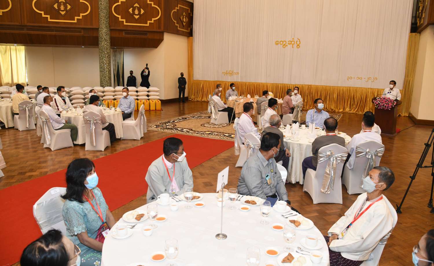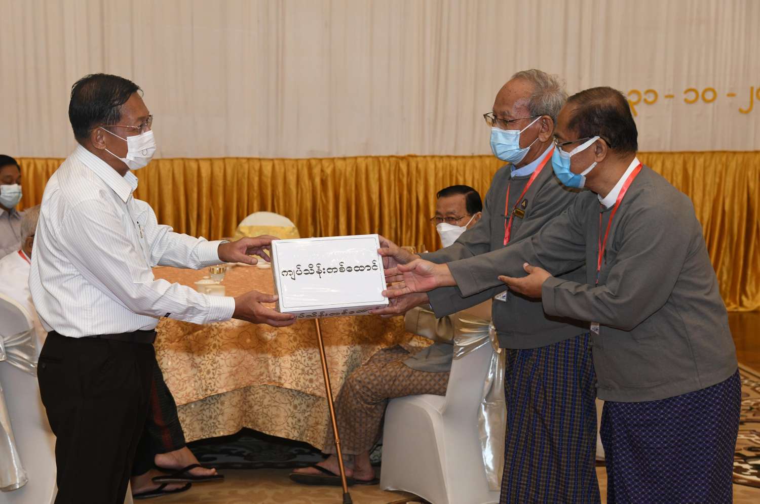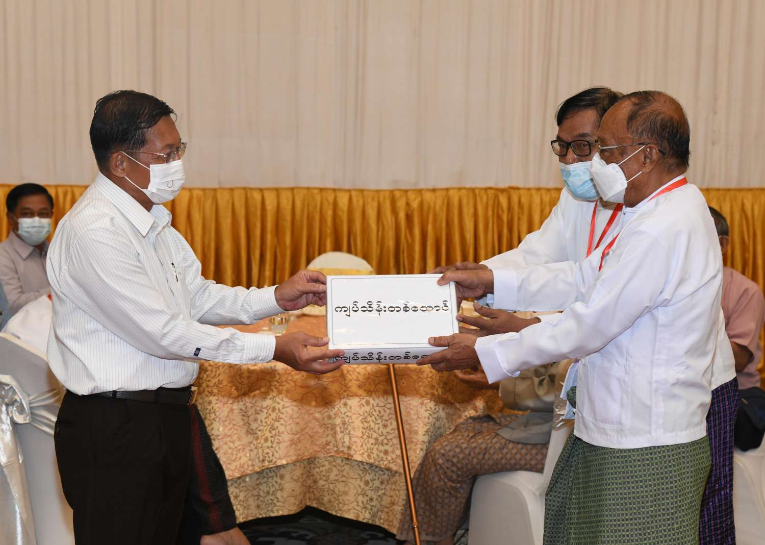 ထို့နောက် နိုင်ငံတော်စီမံအုပ်ချုပ်ရေးကောင်စီ ဥက္ကဋ္ဌ၊ နိုင်ငံတော် ဝန်ကြီးချုပ် က စာပေ၊ ရုပ်ရှင်၊ သဘင်၊ ဂီတ အနုပညာရပ်ဝန်းအသီးသီးအတွက် ရံပုံငွေ ကျပ်သိန်း ၄၀၀၀၊ ဆန်အိတ် ၁၀၀ ၊ ဆီပိဿာ ၅၀၀ နှင့် ပဲပိဿာ ၃၀၀ တို့အား ပေးအပ်ရာ စာပေနှင့် စာနယ်ဇင်းကဏ္ဍမှ အနုပညာရှင်များကိုယ်စား မြန်မာနိုင်ငံ စာရေးဆရာအသင်း အတွင်းရေးမှူး ဦးညွန့်တင်၊ တွဲဘက်အတွင်းရေးမှူး ဦးမျိုးထွန်း (မောင်စိမ်းနောင်-လယ်ဝေး) တို့ကလည်းကောင်း၊ မြန်မာနိုင်ငံရုပ်ရှင်ကဏ္ဍမှ အနုပညာရှင်များကိုယ်စား မြန်မာနိုင်ငံ ရုပ်ရှင်အစည်းအရုံး ဒုတိယဥက္ကဋ္ဌ ဦးအေးကြူလေး၊ အတွင်းရေးမှူး ဦးဇော်မြင့်ဦး တို့ကလည်းကောင်း၊ မြန်မာနိုင်ငံသဘင်ပညာရှင်များ ကိုယ်စား မြန်မာနိုင်ငံသဘင်အစည်း အရုံး အမှုဆောင် ဦးဌေးလွင်နှင့် တာဝန်ရှိသူတစ်ဦးကလည်းကောင်း၊ မြန်မာနိုင်ငံဂီတ ပညာရှင်များကိုယ်စား မြန်မာနိုင်ငံဂီတ အစည်းအရုံး(ဗဟို)မှ ယာယီအမှုဆောင်အဖွဲ့ ဥက္ကဋ္ဌ ဦးလွင်မြင့်နှင့် တာဝန်ရှိသူတစ်ဦးတို့က လည်းကောင်း လက်ခံရယူကြသည်။