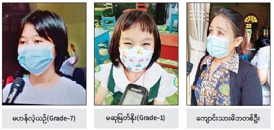 ဒီတစ်ခေါက်မှာ ကိုဗစ်ကာကွယ်ဆေး လည်း ထိုးထားတယ်ဆိုတော့ ရောဂါ ကူးစက်မှုကနည်းနည်း လျော့ကျသွားမယ် လို့ထင်ပါတယ်။ သမီးတို့က ပညာလိုလား သူတွေမို့ ကျောင်းကို မတက်မဖြစ်တက် ရမှာပဲ။ သမီးတို့ ကျောင်းပိတ်လိုက်တဲ့ အချိန်မှာ အတိုင်းအတာ တစ်ခုအထိ စာတွေ ပြတ်လပ်သွားခဲ့တယ်။ တချို့ဆို စိတ်ပျက်သွားတာမျိုးတွေ ဖြစ်နေကြ တယ်။ အဲဒါကြောင့် သမီးကတော့ ကျောင်းကို မဖြစ်မနေတက်တယ်။ သမီး စာတွေနဲ့ အဆက်မပြတ်ချင်ဘူး၊ ကျောင်း တွေ ပြန်ဖွင့်လိုက်တဲ့အတွက် ဆရာမတွေ၊ သူငယ်ချင်းတွေနဲ့ ပြန်တွေ့ပြီး ရင်းနှီးမှု တွေပြန်ရတဲ့အတွက် ဝမ်းသာပါတယ်။ အဲဒီအတွက် နိုင်ငံတော်အစိုးရကို အလွန် ကျေးဇူးတင်ပါတယ်ရှင့်။