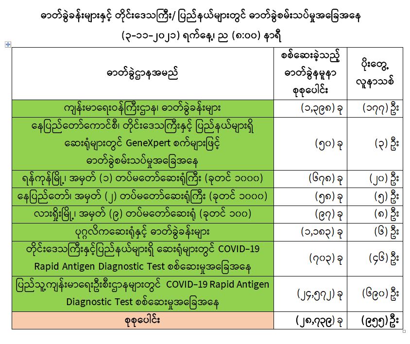 COVID-19 ရောဂါ ကာကွယ်ထိန်းချုပ်ရေးအတွက် တိုင်းဒေသကြီး/ပြည်နယ်များတွင် COVID-19 ရောဂါကာကွယ်ဆေးကို ဦးတည်အုပ်စုများသတ်မှတ်၍ ထိုးနှံပေးလျက်ရှိရာ (၂-၁၁-၂၀၂၁) ရက်နေ့အထိ လူဦးရေ စုစုပေါင်း (၁၃,၄၈၄,၉၆၃) ဦးအား ထိုးနှံပေးပြီးဖြစ်၍ ကာကွယ်ဆေး နှစ်ကြိမ် အပြည့် ထိုးနှံပြီးစီးသူ (၇,၃၉၉,၉၈၆) ဦးနှင့် ပထမအကြိမ်ထိုးနှံပြီးစီးသူ (6,084,977) ဦး ရှိပြီဖြစ်ပါသည်။ သို့ဖြစ်ပါ၍ (၂-၁၁-၂၀၂၁) ရက်နေ့အထိ မြန်မာနိုင်ငံတွင် COVID-19 ရောဂါ ကာကွယ် ဆေးအကြိမ်ရေ စုစုပေါင်း (၂၀,၈၈၄,၉၄၉) ကြိမ် ထိုးနှံပြီး ဖြစ်ပါသည်။