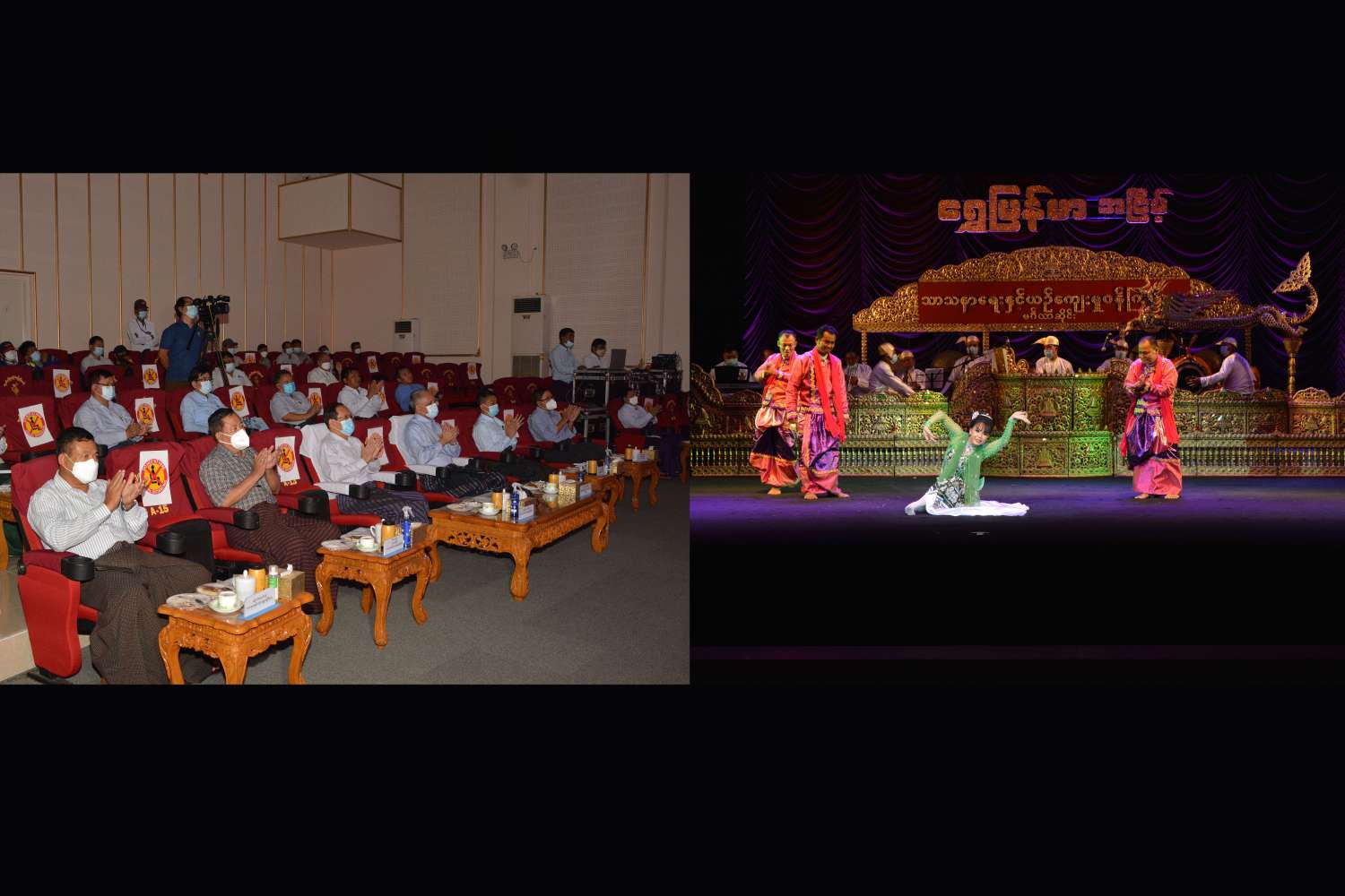 သာသနာရေးနှင့်ယဉ်ကျေးမှုဝန်ကြီးဌာနသည် ရိုးရာယဉ်ကျေးမှု အနုသုခုမအမွေအနှစ်များကို ရှာဖွေခြင်း၊ ဖော်ထုတ်ထိန်းသိမ်းခြင်းနှင့် တိုးတက်ပြန့်ပွားစေရန် ဆောင်ရွက်ခြင်းစသည့် လုပ်ငန်း တာဝန်များကို ဆောင်ရွက်လျက်ရှိပြီး ကိုဗစ် 19 ကာလအတွင်း အများပြည်သူများ စိတ်အပန်းပြေ စေရေးအတွက် မြန်မာ့ရိုးရာယဉ်ကျေးမှုများကို အခြေခံသည့် ဖျော်ဖြေရေး အစီအစဉ်များကို ဖော်ထုတ်ပြသရန် ရည်ရွယ်၍ နေပြည်တော်ရှိ အနုပညာဦးစီးဌာန လေ့ကျင့်ရေး ဇာတ်ရုံ၌ “ရွှေမြန်မာ” အငြိမ့်ခန်းအစီအစဉ်(၂)ကို ဇာတ်တိုက်လေ့ကျင့်လျက်ရှိရာ သာသနာရေးနှင့်ယဉ်ကျေးမှု ဝန်ကြီးဌာန ပြည်ထောင်စုဝန်ကြီး ဦးကိုကို၊ ရင်းနှီးမြှုပ်နှံမှုနှင့် နိုင်ငံခြားစီးပွားဆက်သွယ်ရေးဝန်ကြီး ဌာန ပြည်ထောင်စုဝန်ကြီး ဦးအောင်နိုင်ဦးတို့သည် ဒုတိယဝန်ကြီးများ ဖြစ်ကြသော ဦးအေးထွန်း၊ ဦးထွန်းအုံ တို့နှင့်အတူ ယနေ့နံနက်ပိုင်းတွင် ကြည့်ရှုစစ်ဆေးသည်။