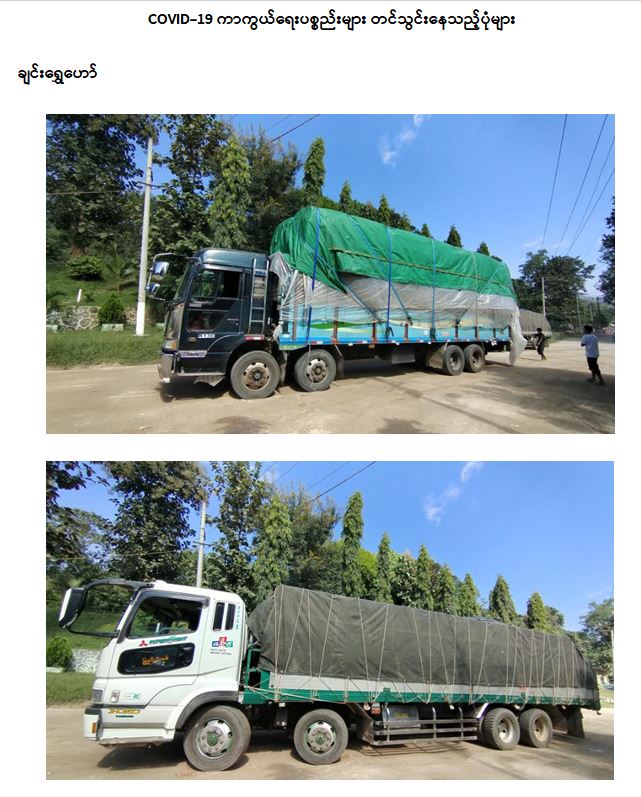 စီးပွားရေးနှင့် ကူးသန်းရောင်းဝယ်ရေးဝန်ကြီးဌာနအနေဖြင့် ကိုဗစ်-၁၉ ရောဂါ ကာကွယ်၊ ထိန်းချုပ်၊ ကုသရေးဆိုင်ရာ ပစ္စည်းများ ကို လေကြောင်း၊ ရေကြောင်းနှင့် နယ်စပ်ကုန်သွယ်ရေး စခန်းများမှ နှောင့်နှေးကြန့်ကြာမှုမရှိ တင်သွင်းနိုင်ရေးအတွက် အချိန်နှင့် တစ်ပြေးညီ စီစဉ်ဆောင်ရွက်ပေးလျက်ရှိရာ ယနေ့တွင် အပြည်ပြည်ဆိုင်ရာဆိပ်ကမ်းနှင့် ချင်းရွှေဟော် ကုန်သွယ်ရေးစခန်းတို့မှ တင်သွင်းရာ၌ကုမ္ပဏီ (၅) ခုမှ ယာဉ်စီးရေ (၇) စီးဖြင့် အောက်စီဂျင် အိုးခွံ (၁၆၀)၊ အောက်စီဂျင် Plant (၁)ခု၊ အိမ်သုံး အောက်ဆီဂျင်စက် (Oxygen Concentrator) (၁၃) ခု၊ PPE ဝတ်စုံ (၁၈၈၀၀) နှင့် နှာခေါင်းစည်း (Mask) (၄၄) တန်တို့ကို တင်သွင်းခဲ့ပြီး အောက်ဆီဂျင် Plant (၁)ခုမှာ ဆိပ်ကမ်းမှ ရန်ကုန်မြို့သို့ဖြစ်ကြောင်း သိရှိရသည်။