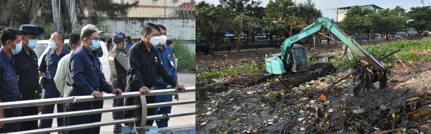 ရန်ကုန်တိုင်းဒေသကြီး စည်ပင်သာယာရေးဝန်ကြီး ရန်ကုန်မြို့တော်ဝန် ဦးဗိုလ်ဌေးသည် ဒုတိယမြို့တော်ဝန် ဦးညီညီ၊ အတွင်းရေးမှူး ဦးညွန့်ဖေနှင့် ကော်မတီဝင်များ၊ သက်ဆိုင်ရာ တာဝန်ရှိသူများနှင့်အတူ ယနေ့နံနက် ၇ နာရီက လှိုင်သာယာ (အရှေ့ပိုင်း) မြို့နယ်၊ ရန်ကုန်-ပုသိမ် လမ်းမ၊ ရန်ကုန်-ညောင်တုန်းလမ်းဆုံမှ တပင်ရွှေထီး လမ်းအကြား ရေနုတ်မြောင်း အရှည်ပေ (၁၃၀၀၀) တစ်လျှောက် အမှိုက်များ၊ မြောင်းချေးများ တူးဖော်ဆယ်ယူ ရှင်းလင်းနေမှုကို ကြည့်ရှုစစ်ဆေးသည်။