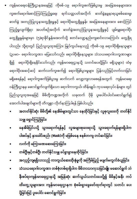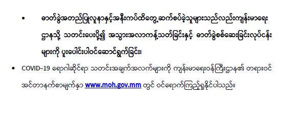ကျန်းမာရေးဝန်ကြီးဌာနအနေဖြင့် နိုင်ငံအတွင်း ကူးစက်ဖြစ်ပွားနေသော COVID-19 ရောဂါ ကာကွယ်၊ ကုသ၊ ထိန်းချုပ်ရေး လုပ်ငန်းများကို အရှိန်အဟုန်မြှင့် ဆောင်ရွက်လျက်ရှိပါသည်။