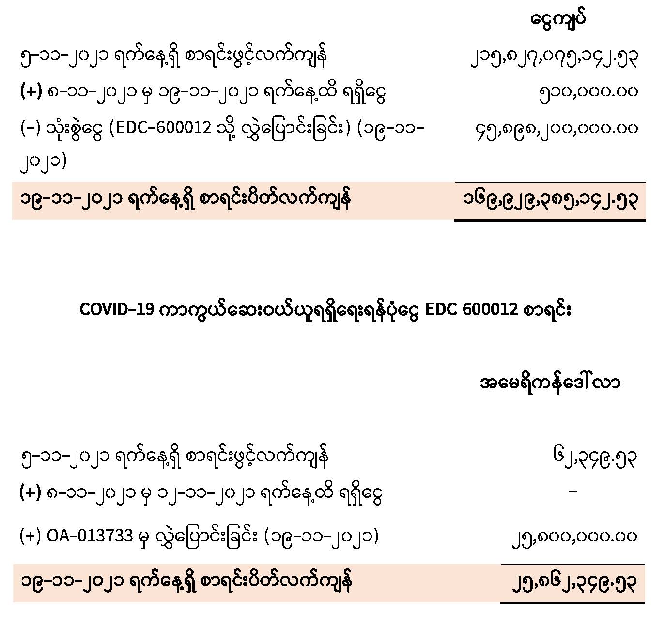 မြန်မာ့စီးပွားရေးဘဏ် (နေပြည်တော်)တွင် ဖွင့်လှစ်ထားရှိသော COVID-19 ကာကွယ်ဆေးဝယ်ယူ ရရှိရေးရန်ပုံငွေ (COVID-19 Vaccination Fund) မြန်မာကျပ်ငွေစာရင်း OA 013733 သို့ ၈-၁၁-၂၀၂၁ ရက်မှ ၁၉-၁၁-၂၀၂၁ ရက်အထိ ပြည်တွင်း / ပြည်ပ အလှူရှင်များမှ ထည့်ဝင် လှူဒါန်းငွေ စုစုပေါင်းမှာ ငွေကျပ် ၀ ဒသမ ၅၁၀ သန်း ဖြစ်သည်။ ၁၉-၁၁-၂၀၂၁ ရက်အထိ ရန်ပုံငွေစာရင်း၏ အခြေအနေမှာ အောက်ပါအတိုင်းဖြစ်သည်-