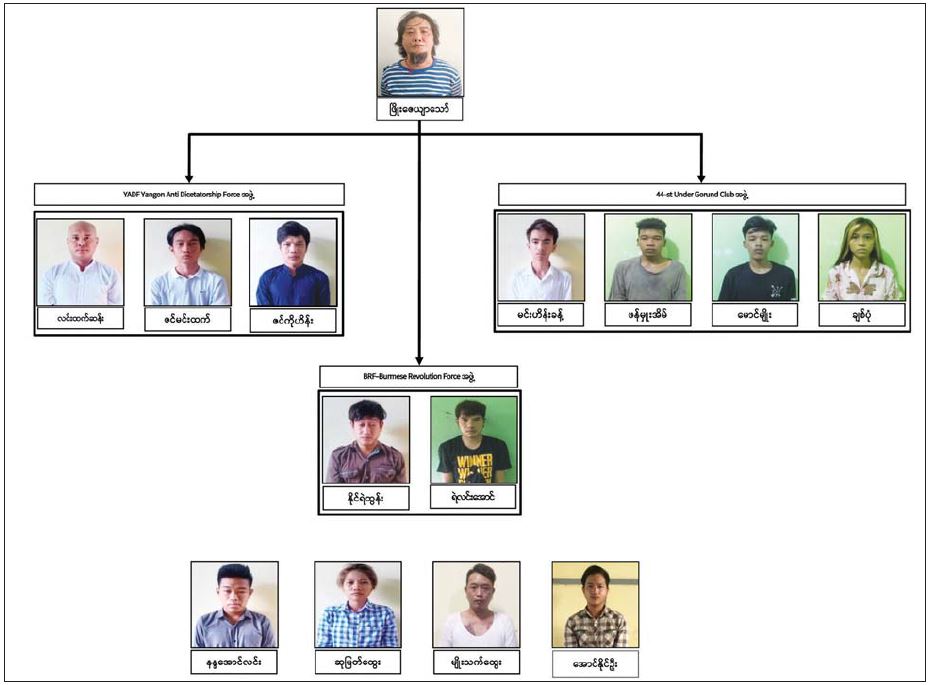 အကြမ်းဖက်အဖွဲ့အစည်းဖြစ်သော NUG ၏ စေခိုင်းချက်အရ ရန်ကုန်မြို့အတွင်း အကြမ်းဖက်လုပ်ငန်းများ ဆောင်ရွက်ခဲ့သည့် ဖြစ်စဉ်တွင် ပါဝင်ကျူးလွန်ခဲ့သော ဖမ်းဆီးရမိတရားခံ NLD ပါတီဝင် မောင်ကျော်(ခ) ဖြိုးဇေယျာသော် အပါအဝင် ကျား ၄၃ ဦး၊ မ ခုနစ် ဦး၊ ပေါင်း ၅၀ ဦးတို့အား လက်နက်မျိုးစုံ ၁၂၇ လက်၊ လက်လုပ်ပစ္စတို ၁၂၈ လက်၊ ကျည်အိမ်မျိုးစုံ ၂၇၆ ခု၊ ကျည်မျိုးစုံ ၁၆၀၅၇ တောင့်၊ ၄၀ မမဗုံးသီး ၄၃ လုံး၊ လက်လုပ်ဗုံး ၁၁ လုံး၊ ရီမုဒ်မိုင်း ၄ လုံး၊ ရှေ့ထွက်မိုင်း ၁၀ လုံး၊ မီးခိုးဗုံး ၅ လုံး၊ ရှို့ပစ် ၂ လုံး၊ လက်ပစ်ဗုံး ၁၈ လုံး၊ ကြိုးဆွဲလက်ပစ်ဗုံး ၁၅ လုံး၊ လက်လုပ်ဗုံး ၁၃၈ လုံး၊ လက်လုပ်ဗုံး(အကြီး) ၃ လုံး၊ မီးရှို့ လက်လုပ်ဗုံး ၃၉ လုံး၊ ယမ်းပြင်း ၂၅ ထုပ်၊ လက်လုပ်ယမ်း ၄၃ ထုပ်၊ ယမ်းကြိုး(၁၀၀ ပေ) ၁ ခွေ၊ ဒီတိုနေတာ ၈၀၀ ချောင်း၊ TNT ယမ်း (၀.၂၅)ပေါင် ၁၅၃ တောင့်၊ TNT ယမ်း(၁ ပေါင်) ၁၀ တောင့်၊ C4 ယမ်း (၁.၂၅) ပေါင် ၉ တောင့်၊ Transistor ၁၄ ဗူး၊ ကီးပတ်ဖုန်း ၁၆ လုံး၊ နာရီ ၇ လုံး၊ လမ်းလျောက် စကားပြောစက် ၄ လုံး၊ ဆက်သွယ်ရေးအထိုင်စက် ၁ လုံး၊ ၂.၅ လက်မသံ ၅ ပိဿာ၊ မှန်ပြောင်း ၂ ခု၊ ဂြိုလ်တုဖုန်း ၁၃ လုံး၊ Laptop ၂ လုံး၊ Hard Disk ၁ ခု၊ ATM ကတ်များ၊ နိုင်ငံကူးလက်မှတ်စာအုပ် ၁ အုပ်၊ ရန်ကုန်မြို့အတွင်း အကြမ်းဖက် ဖောက်ခွဲဖျက်ဆီးရေး ပြုလုပ်မည့်စာရင်းများ၊ လုပ်ကြံသတ်ဖြတ်မည့် စာရင်းများပြုစုထားသည့် မှတ်တမ်းစာအုပ်များ၊ စိတ်ကြွရူးသွပ်ဆေးပြားများနှင့် အခြားဆက်စပ်ပစ္စည်းများအား သိမ်းဆည်းရမိခဲ့သည့်ဖြစ်စဉ်အား နိုဝင်ဘာလ ၂၀ ရက်တွင် သတင်းထုတ်ပြန်ခဲ့ပြီးဖြစ်သည်၊၊