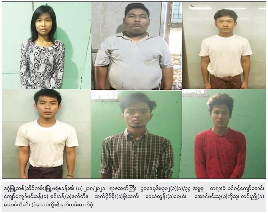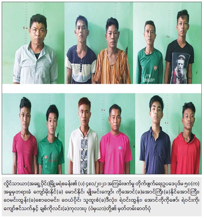 ရန်ကုန်တိုင်းဒေသကြီး၊ လှိုင်သာယာ(အရှေ့ပိုင်း)မြို့နယ်၊ ရွှေလင်ပန်း ကျေး ရွာ၌ ကျော်မိုးနိုင်(ခ)မောင်နိုင်(ဘ)ဦးမြင့်ဦး အပါအဝင် ၁၈ ဦးသည် စက်တင်ဘာ ၂၈ ရက် ည ၁၀ နာရီခန့်တွင် ကျူးကျော်နေအိမ်နှင့် အိမ်ခြံမြေကိစ္စများတွင် အခကြေး ငွေရယူ၍ နေအိမ်များနှင့် ခြံစည်းရိုးများအား ဖျက်ဆီးခြင်း၊ နေအိမ်အတွင်းရှိ လူများ အား တုတ်၊ ဓားများ ကိုင်ဆောင်၍ အကြမ်းဖက်တိုက်ခိုက် ခြိမ်းခြောက်ခြင်းစသည့် ဉပဒေမဲ့လုပ်ရပ်များကို ကျူးလွန်ခဲ့သည့် အတွက်ကြောင့် အကြမ်းဖက်မှုတိုက်ဖျက် ရေးဉပဒေပုဒ်မ ၅၀(က)ဖြင့်လည်းကောင်း၊ ရဲထက်(ဘ) ဦးသိန်းဦး သည် ဧပြီ ၁၀ ရက်နေ့မှ ၁၇ ရက်အထိ တိုင်းရင်းသားလက်နက်ကိုင်အဖွဲ့ နယ်မြေအတွင်း သင်တန်းတက်ရောက်ခဲ့သဖြင့် ပြည်ထောင်စုသမ္မတမြန်မာနိုင်ငံတော် အကြမ်းဖက် မှုတိုက်ဖျက်ရေး ဗဟိုအဖွဲ့၊ အမိန့်ကြေညာစာအမှတ်၊(၂/၂၀၂၁)အရ အကြမ်းဖက်မှု တိုက်ဖျက်ရေးဉပဒေပုဒ်မ ၅၀(ည)ဖြင့် လည်းကောင်း၊ မောင်မောင်ကျော်တင့်(ခ) ဘိုဘိုကျော် (ဘ)ဦးလှတင့်သည် ဖေဖော်ဝါရီလမှစ၍ CRPH၊ NUG၊ PDF အမည်ခံ အကြမ်းဖက်အဖွဲ့များအား ငွေကြေးဆိုင်ရာ ထောက်ပံ့ပေးခဲ့မှုဖြင့် အကြမ်းဖက်မှု တိုက်ဖျက်ရေး ဉပဒေပုဒ်မ ၅၀(ည)ဖြင့် လည်းကောင်း၊ ရဲထက်အောင်(ခ)ရဲထက် (ဘ)ဦးညွန့်အောင်သည် ဖေဖော်ဝါရီလမှစ၍ ရန်ကုန်တိုင်းဒေသကြီး အတွင်း ဆူပူအကြမ်းဖက်မှု ဖြစ်စဉ်များတွင် တတ်ကြွစွာပါဝင်လှုပ်ရှားခြင်း၊ အပြစ်မဲ့ပြည်သူ များအား ဒလန်ဟု စွပ်စွဲ ပြောဆိုသတ်ဖြတ်ခြင်းတို့တွင် ပါဝင်ခြင်း၊ အကြမ်းဖက်ဗုံးခွဲ တိုက်ခိုက်ခြင်းများကို ဆောင်ရွက်ခဲ့သဖြင့် အကြမ်းဖက်မှုတိုက်ဖျက်ရေး ဥပဒေပုဒ်မ ၅၀(ဈ)ဖြင့် လည်းကောင်း၊ အောင်မင်းသူ(ခ)ကိုသူ(ဘ)ဦးထိန်ဝင်း အပါအဝင် ၈ ဦးသည် ဧပြီ ၂၈ ရက်မှစ၍ တိုင်းရင်းသား လက်နက်ကိုင်အဖွဲ့ နယ်မြေအတွင်း သင်တန်းတက်ရောက်ခြင်း၊ အုပ်ချုပ်ရေးမှူးရုံးများအား ဖောက်ခွဲဖျက်ဆီးခြင်း များကို ဆောင်ရွက်ခဲ့ပြီး ပြည်ထောင်စုသမ္မတမြန်မာနိုင်ငံတော် အကြမ်းဖက်မှု တိုက်ဖျက်ရေးဗဟိုအဖွဲ့၊ အမိန့်ကြေညာစာအမှတ်၊(၂/၂၀၂၁)အရ အကြမ်းဖက်မှု တိုက်ဖျက်ရေး ဥပဒေပုဒ်မ ၅၀(က)ဖြင့် လည်း ကောင်း စစ်အုပ်ချုပ်ရေး (Martial Law) စစ်ခုံရုံးဖွဲ့၍ စစ်ဆေးမှုများဆောင်ရွက်ခဲ့ရာ နိုဝင်ဘာ ၂၃ ရက်တွင် ၎င်းတို့ ၂၉ ဦးအား “ထောင်ဒဏ်တစ်သက် ”ပြစ်ဒဏ်အား အသီးသီး အမိန့်ချမှတ်လိုက်ကြောင်း သိရှိရသည်။