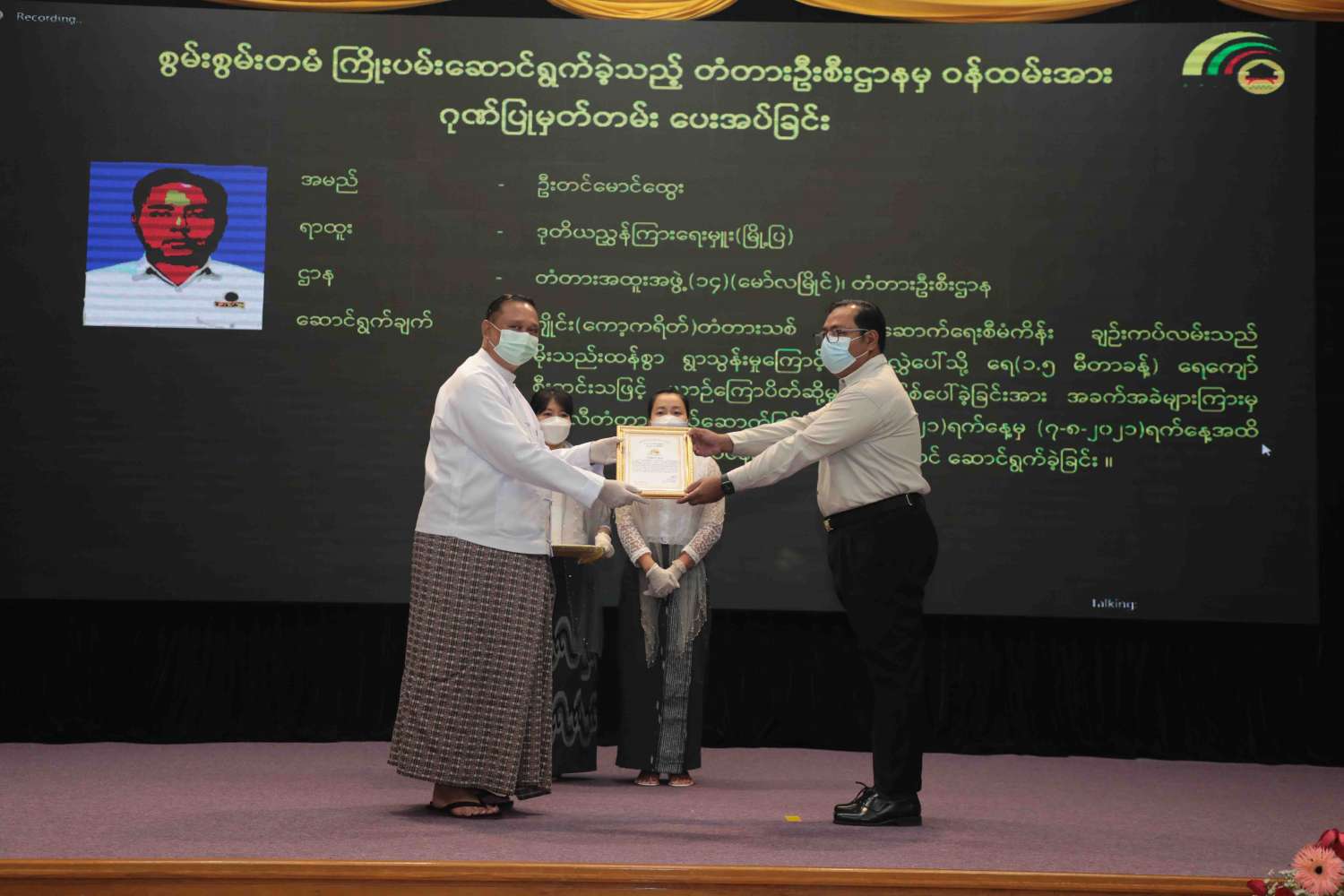 ထို့နောက် ဒုတိယဝန်ကြီး ဦးမင်းထိန် က ရုံးချုပ်နှင့် တိုင်းဒေသကြီး/ပြည်နယ် (၁၇)ခုတို့မှ နည်းပညာဆိုင်ရာ စာတမ်းဖတ်ပွဲတွင် ထူးချွန်ဆုရရှိသူများကို လည်းကောင်း၊ အမြဲတမ်းအတွင်းဝန် ဦးအောင်မြင့်ဦးက နည်းပညာဆိုင်ရာ စာတမ်းဖတ်ပွဲတွင် စာတမ်း ဖတ်ကြားသည့် ပြည်ထောင်စုဝန်ကြီးရုံး ၊ အဆောက်အဦ ဦးစီးဌာန၊ လမ်းဦးစီးဌာန၊ တံတား ဦးစီးဌာန၊ မြို့ပြနှင့် အိမ်ရာဖွံ့ဖြိုးရေးဦးစီးဌာနနှင့် ကျေးလက်လမ်း ဖွံ့ဖြိုးရေး ဦးစီးဌာနတို့မှ စာတမ်းရှင်(၃၄)ဦးကို ဂုဏ်ပြုမှတ်တမ်းလွှာများ ပေးအပ်ကြသည်။