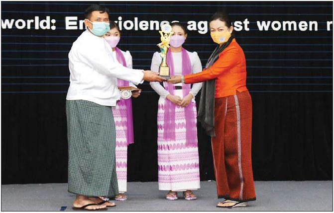 ယင်းနောက် အမျိုးသမီးများ အပေါ် အကြမ်းဖက်မှုပပျောက်ရေး (၁၆) ရက်တာ အကြိုလှုပ်ရှားမှု အလွတ်တန်းဆောင်းပါးပြိုင်ပွဲ ပထမဆုရရှိသူ ဦးသန်းထွဋ်ဝင်း နှင့် ဉာဏ်စမ်းပဟေဠိဖြေဆိုပွဲမှ ဆုရရှိသူ ဦးဇော်ဟိန်းအောင်တို့ အား ပြည်ထောင်စုဝန်ကြီးက ဆုပေးအပ်ချီးမြှင့်သည်။