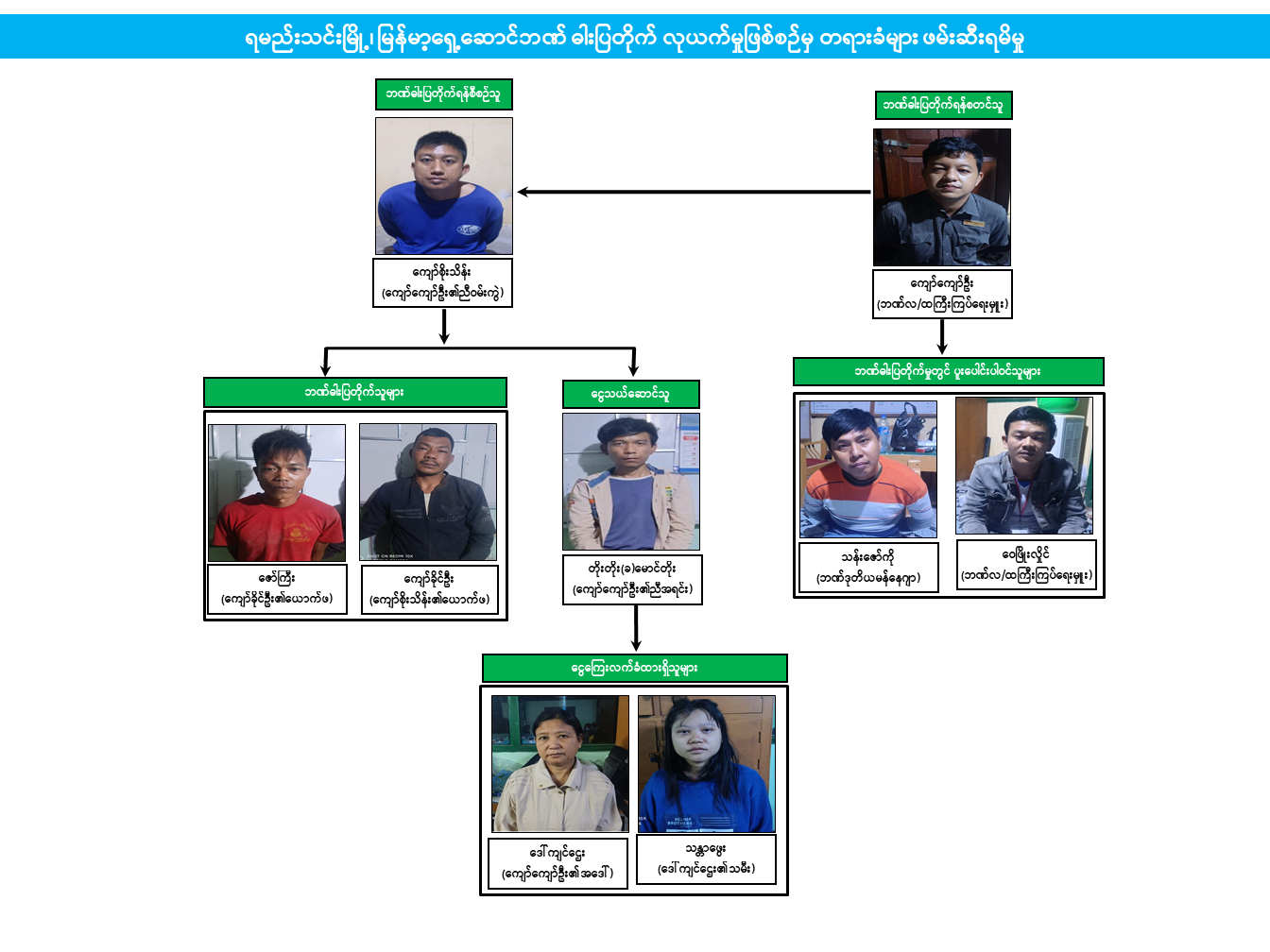 ဓါးပြတိုက်မှုဖြစ်စဉ်နှင့် ပတ်သက်၍ တရားခံများအား ဖမ်းဆီးရမိရေး စုံစမ်း ဖော်ထုတ်မှုများ ပြုလုပ်ခဲ့ရာ နိုဝင်ဘာလ ၂၆ ရက် ညပိုင်းတွင် ပြစ်မှုကျူးလွန်ရာတွင် ပူးပေါင်းပါဝင်ကျူးလွန်ခဲ့သူများ ဖြစ်သည့် အဆိုပါဘဏ်မှ ဝန်ထမ်းများဖြစ်သော ရမည်းသင်းမြို့နေ လက်ထောက်ကြီးကြပ် ရေးမှူးများဖြစ်သည့် ကျော်ကျော်ဦး(၃၃)နှစ်နှင့် ဝေဖြိုးလှိုင်(၃၁)နှစ်၊ ဘဏ်ခွဲဒုမန်နေဂျာဖြစ်သူ သန်းဇော်ကို(၄၃)နှစ်တို့အား ဖမ်းဆီး ရမိခဲ့သည်။