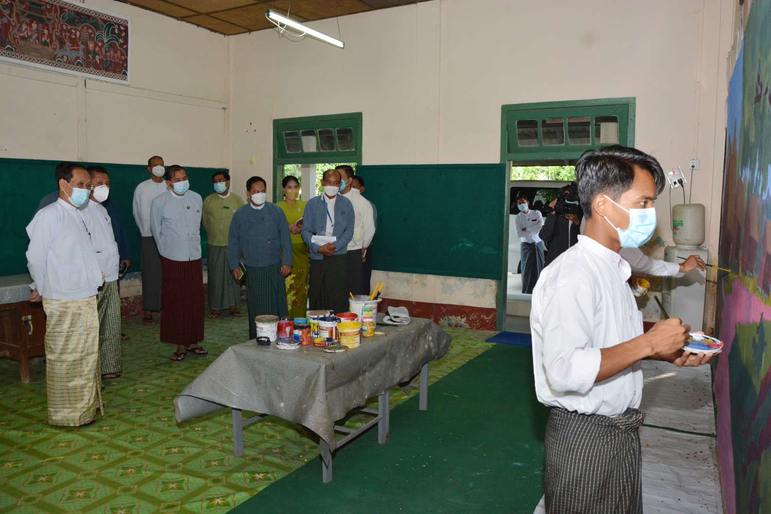 သာသနာရေးနှင့်ယဉ်ကျေးမှုဝန်ကြီးဌာန ပြည်ထောင်စုဝန်ကြီးနှင့် မန္တလေးတိုင်းဒေသကြီး အစိုးရအဖွဲ့ ဝန်ကြီးချုပ်တို့သည် နံနက် ၈ နာရီက မန္တလေးမြို့ အောင်မြေသာစံမြို့နယ်ရှိ အနုပညာဦးစီးဌာနသို့ရောက်ရှိပြီး အနုပညာအထက်တန်းကျောင်း ပန်တျာ၊ ပန်းချီ ပန်းပု ဌာနရှိ ကျောင်းသားများ၏ လက်တွေ့ပညာသင်ကြားနေမှုများကို ကြည့်ရှုစစ်ဆေး၍ ထုတ်လုပ် ဌာနစုရှိ လေ့ကျင့်ရေး ဇာတ်ရုံ၌ အနုပညာအထက်တန်းကျောင်း(မန္တလေး)မှ ကျောင်းသား၊ ကျောင်းသူများ၏ စွမ်းရည်ပြတင်ဆက်မှုနှင့် ထုတ်လုပ်ဌာနစု (မန္တလေး)မှ အနုပညာရှင် ဝန်ထမ်းများ၏ ဖျော်ဖြေတင်ဆက်မှုများကို ကြည့်ရှုအားပေးကာ ပြည်ထောင်စုဝန်ကြီးက အနု ပညာ အထက်တန်းကျောင်း (မန္တလေး)မှ ကျောင်းသား၊ ကျောင်းသူလေးများကို အားပေး စကားပြောကြားသည်။