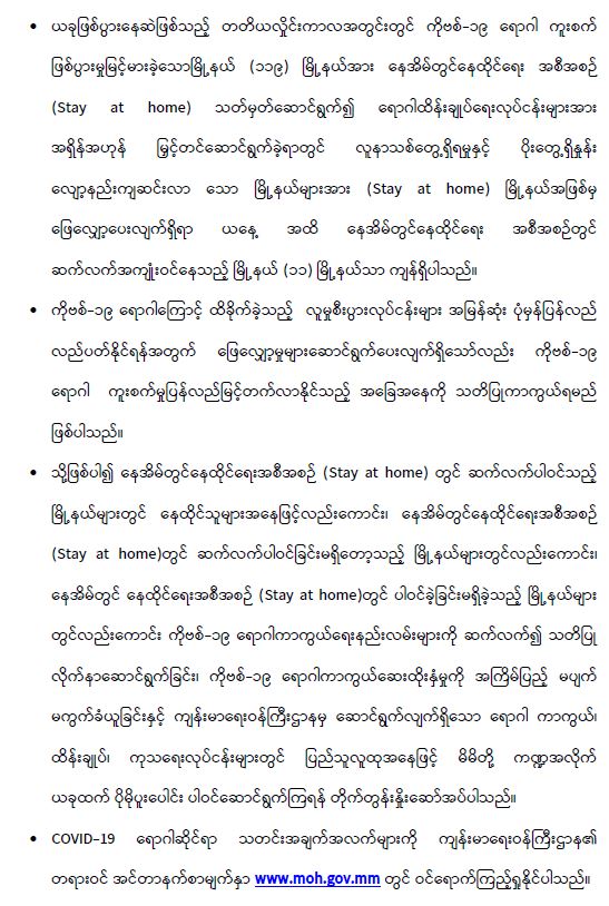 ကျန်းမာရေးဝန်ကြီးဌာနအနေဖြင့် နိုင်ငံအတွင်း ကူးစက်ဖြစ်ပွားနေသော COVID-19 ရောဂါ ကာကွယ်၊ ကုသ၊ ထိန်းချုပ်ရေး လုပ်ငန်းများကို အရှိန်အဟုန်မြှင့် ဆောင်ရွက်လျက်ရှိပါသည်။