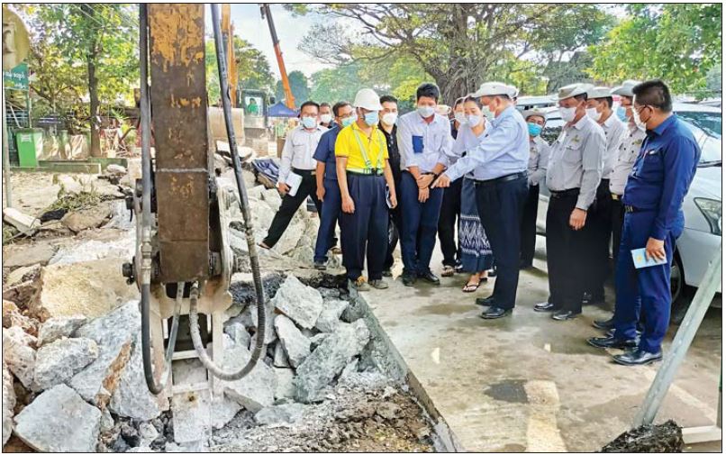 ဆက်လက်၍ ပြည်ထောင်စုဝန်ကြီးနှင့်အဖွဲ့သည် ရန်ကုန် - ပြည်လမ်းပိုင်း မှော်ဘီမြို့အတွင်းရှိ ဆောက်လုပ်ရေးဝန်ကြီးဌာန လမ်းဦးစီးဌာနပိုင် လမ်းဧရိယာတွင် ရန်ကုန်မြို့တော်စည်ပင်သာယာ ရေးကော်မတီ အင်ဂျင်နီယာဌာန (ရေနှင့်သန့်ရှင်းမှု) မှ မြေအောက်အနက် ၁၀ ပေတူး၍ ၅ ပေအချင်းရှိ ရေပိုက်လိုင်းသွယ်တန်းထားရှိမှု၊ ရေပိုက်တစ်ခုနှင့် တစ်ခု ချိတ်ဆက်နေမှု၊ ပိုက်မြှုပ်ရန် စက်ယန္တရားဖြင့် ဆောင်ရွက်နေမှုတို့ကို ကြည့်ရှုစစ်ဆေးပြီး ရေပိုက်လိုင်းပေါ်တွင် ပြန်ခင်းသည့်လမ်းဒီဇိုင်းအား ခံနိုင်ဝန် ရှိစေရန် လမ်းသုတေသန ညွှန်ကြားရေးမှူးကိုယ်တိုင် ဦးဆောင်ကွင်းဆင်း၍ စနစ်တကျတွက်ချက်ပြီး နှစ်ဖက်အဖွဲ့များ ညှိနှိုင်းပေါင်းစပ်ဆောင်ရွက်ရန်၊ အများပြည်သူ ဘေးအန္တရာယ်ကင်းရှင်းစွာ ဆောင်ရွက် နိုင်ရေး B.O.T ကုမ္ပဏီမှလည်း အလေးထား ဆောင်ရွက်ရန် တာဝန်ရှိသူများကို မှာကြားသည်။