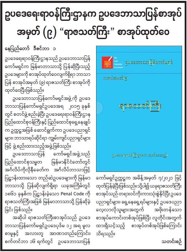 ဥပဒေရေးရာ ဝန်ကြီးဌာနက ဥပဒေဘာသာပြန်စာအုပ် အမှတ်(၉) "ရာဇသတ်ကြီး" စာအုပ်ထုတ်ဝေ