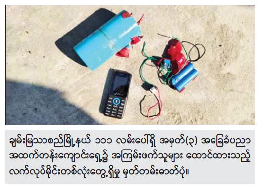 ထိုသို့ အကြမ်းဖက်ဖောက်ခွဲရေး လုပ်ရပ်များပြုလုပ်ခဲ့ရာ ဒီဇင်ဘာ ၁ ရက်နေ့ နံနက် ၈ နာရီခွဲ တွင် မန္တလေးတိုင်းဒေသကြီး၊ ချမ်းမြသာစည်မြို့နယ်၊ မြို့သစ်(၄)ရပ်ကွက်၊ လမ်း ၆၀ နှင့် ၆၁ လမ်းကြား ၁၁၁ လမ်းပေါ်ရှိ အမှတ်(၃) အခြေခံပညာ အထက်တန်းကျောင်းရှေ့၌ မသင်္ကာဖွယ် အထုပ် တစ်ထုပ်တွေ့ရှိကြောင်း သတင်းအရ လုံခြုံရေးတပ်ဖွဲ့ဝင်များက သွားရောက် စစ်ဆေးခဲ့ရာ ကျောင်းရှေ့ ၁၁၁ လမ်းဘေး၌တွေ့ရသည့် အထုပ်အတွင်းမှ PVC ပိုက်ဖြင့်ပြုလုပ်ထားသည့် လက်လုပ်မိုင်း တစ်လုံးအား တွေ့ရှိရသဖြင့် သက်မဲ့ပြုလုပ်ရှင်းလင်းနေစဉ် အဆိုပါနေရာနှင့် ၁၅ ပေ ခန့်အကွာမှ လက်လုပ်မိုင်းတစ်လုံး ပေါက်ကွဲခဲ့ပြီး ပေါက်ကွဲမှုကြောင့် လူနှင့်အဆောက်အဦ ထိခိုက်ပျက်စီးမှုမရှိကြောင်း သိရသည်။