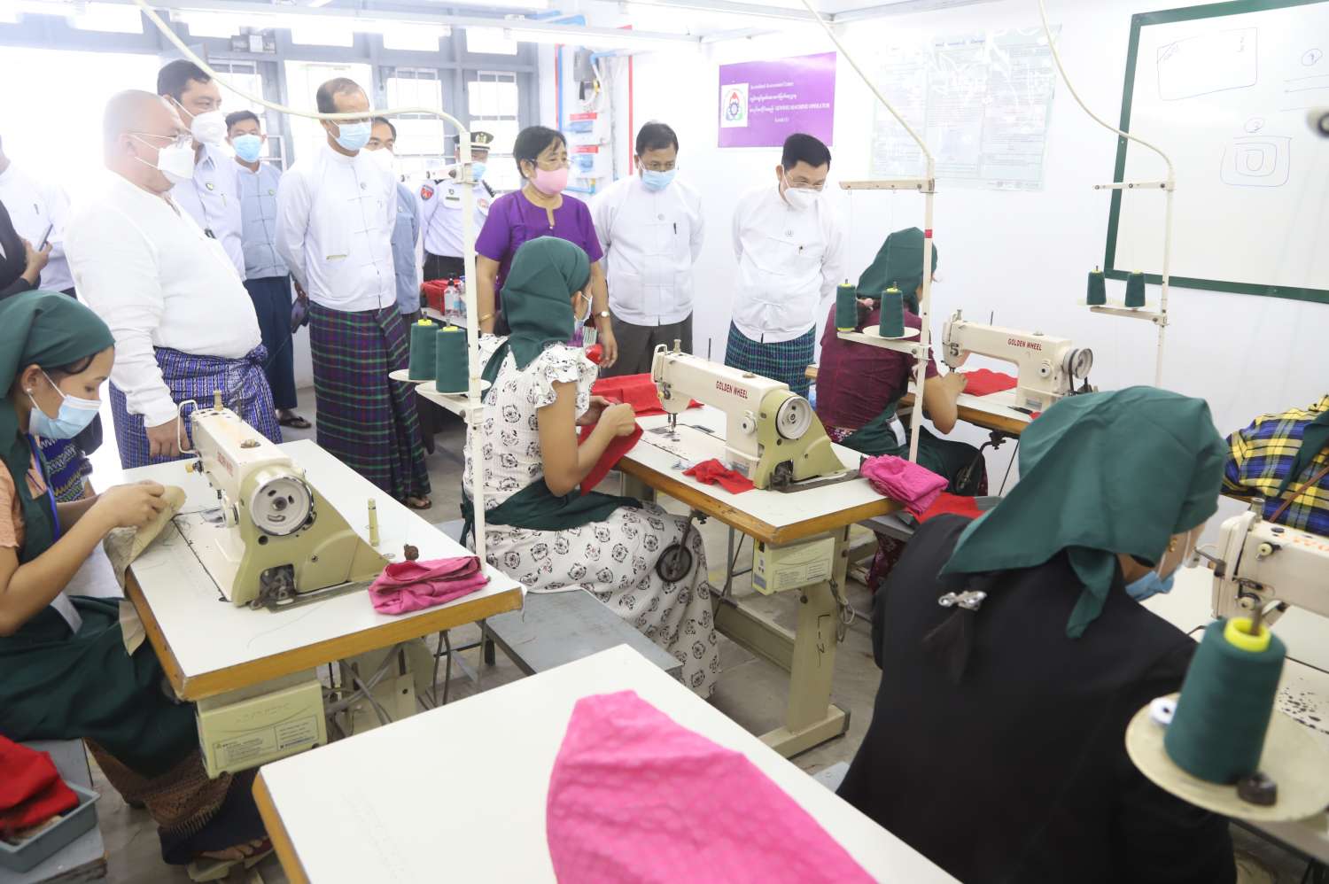 ကြည့်ရှုစစ်ဆေးစဉ် တာဝန်ရှိသူများက စက်ရုံတည်ထောင်ထားရှိမှု၊ လုပ်ငန်းလည်ပတ်နေမှု အခြေအနေနှင့် အထည်ချုပ်လုပ်သားများ၏ ကျွမ်းကျင်မှုစစ်ဆေးအကဲဖြတ် ရေးလုပ်ငန်းစဉ်တို့ ကို ရှင်းလင်းတင်ပြကြရာ ပြည်ထောင်စုဝန်ကြီးက လိုအပ်သည်များ မှာကြားသည်။