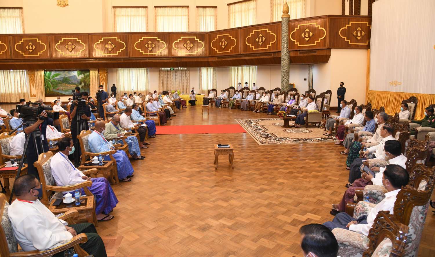 နိုင်ငံတော်စီမံအုပ်ချုပ်ရေးကောင်စီဥက္ကဋ္ဌ နိုင်ငံတော်ဝန်ကြီးချုပ် ဗိုလ်ချုပ်မှူးကြီး မင်းအောင်လှိုင်သည် ယနေ့မွန်းလွဲပိုင်းတွင် ဘာသာပေါင်းစုံ ချစ်ကြည်ညီညွတ်ရေး အဖွဲ့(ဗဟို) ဥက္ကဋ္ဌ ဦးစိန်သန်းနှင့် အလုပ်အမှုဆောင်များအား ရန်ကုန်တိုင်းစစ်ဌာနချုပ်၊ ကုန်းမြင့်သာရှိ ဇေယျာသီရိဗိမာန် ၌ ရင်းရင်းနှီးနှီးတွေ့ဆုံပြီး စားသောက်ဖွယ်ရာ ပစ္စည်းများ ပေးအပ်သည်။