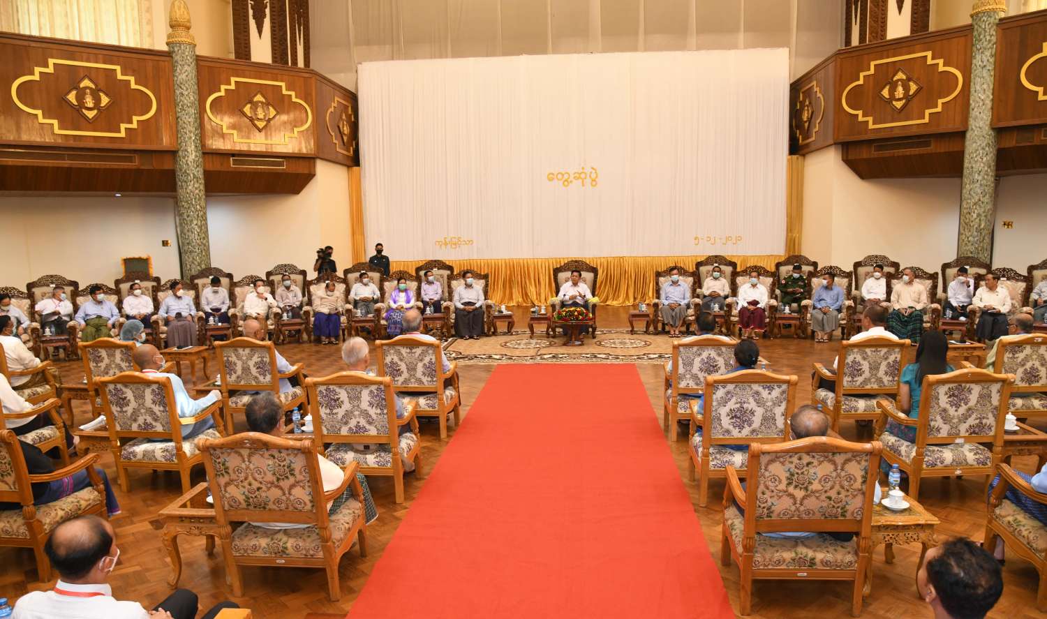 ဆက်လက်၍ နိုင်ငံတော်စီမံအုပ်ချုပ်ရေးကောင်စီဥက္ကဋ္ဌ နိုင်ငံတော်ဝန်ကြီးချုပ်က မိမိတို့အနေ ဖြင့် နိုင်ငံ၏ဖြစ်ပေါ်လာသည့်အခြေအနေများအရ နိုင်ငံတော်တာဝန်များကို ခေတ္တဝင်ရောက် တာဝန်ထမ်းဆောင်နေခြင်းဖြစ်ကြောင်း၊ နိုင်ငံတော်အနေဖြင့် စစ်မှန်သည့် ဒီမိုကရေစီနှင့် ဖက်ဒရယ်ကိုအခြေခံသည့် ပြည်ထောင်စု ကိုလျှောက်လှမ်း နေခြင်းဖြစ်ပြီး ပြည်သူများရွေးချယ် ထားသည့် လမ်းကြောင်းဖြစ်သဖြင့် လုံးဝသွေဖယ် သွားမည်မဟုတ်ကြောင်း၊ နိုင်ငံရေးတာဝန် အားဝင်ရောက် တာဝန်ထမ်းဆောင်ခဲ့ရခြင်းသည် မိမိတို့က ဖန်တီးဆောင်ရွက်ခဲ့ခြင်း မဟုတ်ကြောင်း၊ ၂၀၂၀ ပြည့်နှစ် ပါတီစုံဒီမို ကရေစီအထွေထွေ ရွေးကောက်ပွဲမတိုင်မီ ကာလအတွင်း လွပ်လပ်၍မျှတသည့် ရွေးကောက်ပွဲဖြစ် စေရေး၊ နိုင်ငံရေးတွင်ရိုးသားမှု ရှိစေရေးနှင့် နိုင်ငံရေးအရ လက်စားချေခြင်းများမပြုလုပ်စေရေးအတွက် မိမိအနေဖြင့် အမြဲမပြတ် တိုက်တွန်း ပြောကြား ဆောင်ရွက်ခဲ့ကြောင်း၊ ပါတီစုံဒီမိုကရေစီ အထွေထွေရွေးကောက်ပွဲတွင် အနိုင်ရပါတီမှ ရွေးကောက်ခံကိုယ်စားလှယ်များက သမ္မတရွေးချယ်ခြင်း၊ အစိုးရအဖွဲ့ ဖွဲ့စည်းခြင်းများကို ဆောင်ရွက်ရခြင်း ဖြစ်ကြောင်း၊ သမ္မတမှတစ်ဆင့် တရားသူကြီး များ ခန့်အပ်ခြင်းများကို ဆောင်ရွက်ရခြင်းဖြစ်သဖြင့် အထွေထွေရွေးကောက်ပွဲတွင် မျှတမှုရှိ စေရေးသည် နိုင်ငံအတွက် လွန်စွာအရေးကြီးခြင်းပင် ဖြစ်ကြောင်း၊ ၂၀၂၀ ပြည့်နှစ် အထွေထွေရွေးကောက်ပွဲ ပြုလုပ်ချိန်တွင် မသမာမှုများဖြစ်ပေါ်ခဲ့သည်ကို တွေ့ရှိရကြောင်း၊ ထို့ကြောင့် မိမိတို့အနေဖြင့် ယခုကဲ့သို့ နိုင်ငံတော်တာဝန်များကို ဝင်ရောက် ထမ်းဆောင်ခဲ့ရခြင်း ဖြစ်ကြောင်း။