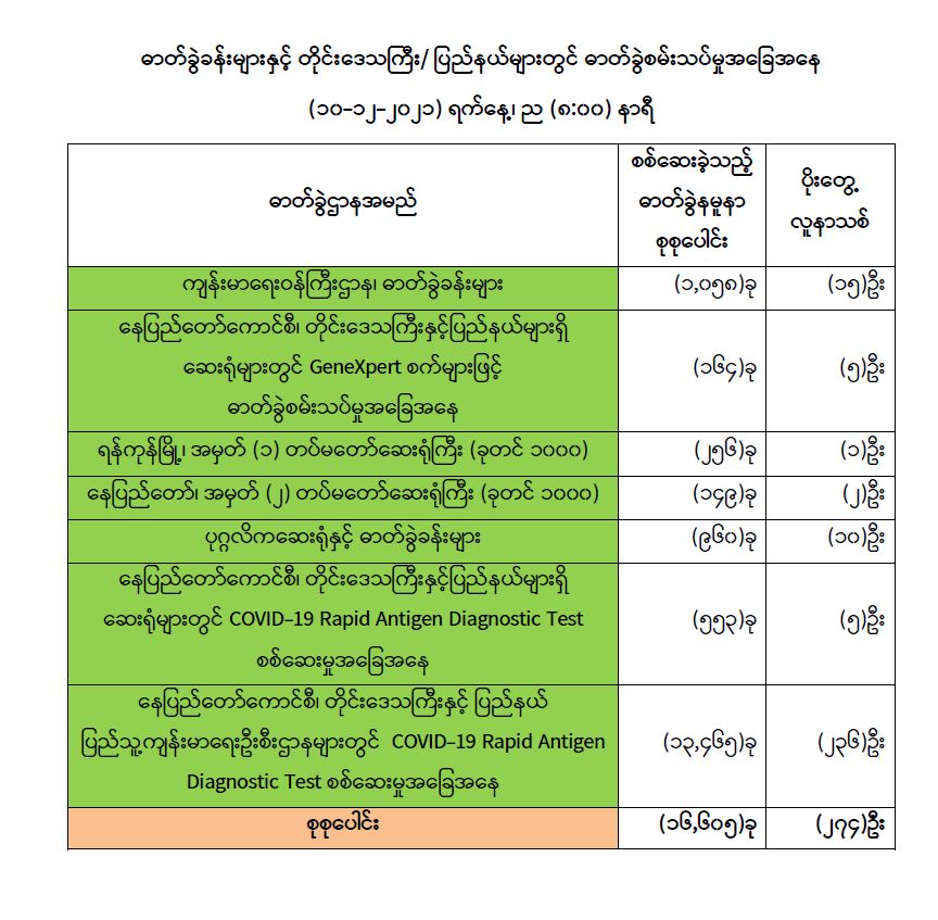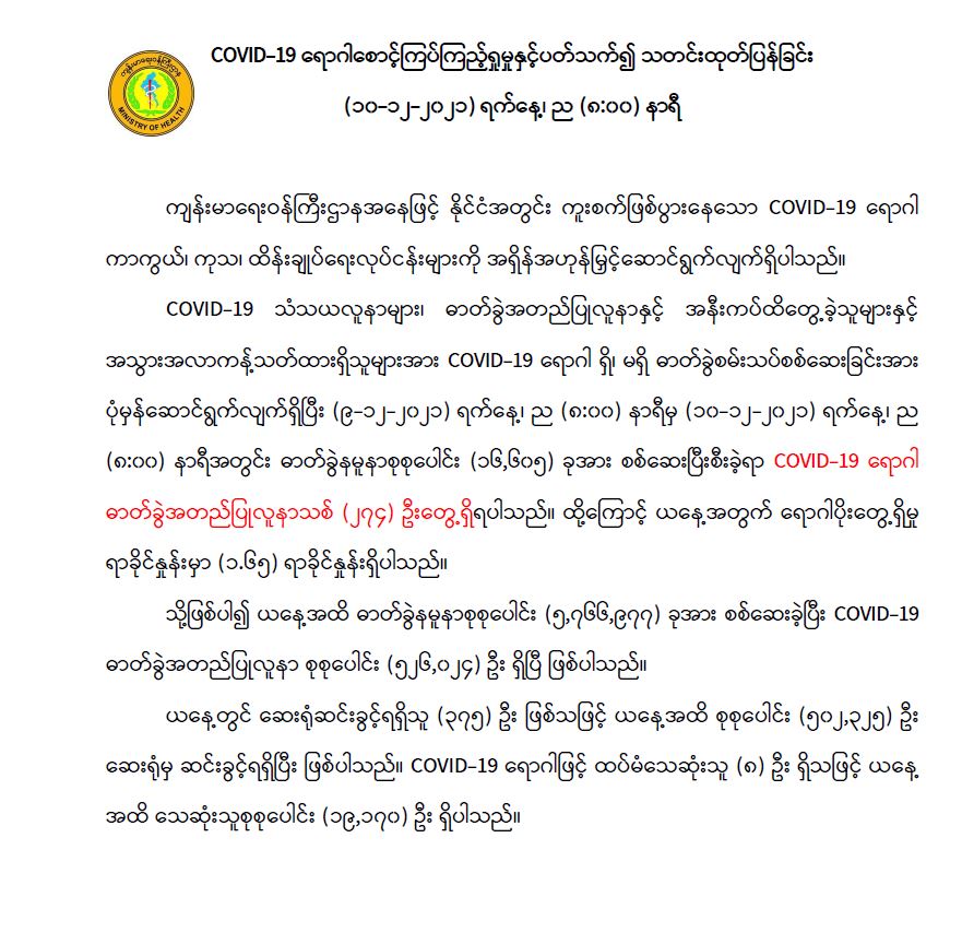 COVID-19 ရောဂါစောင့်ကြပ်ကြည့်ရှုမှုနှင့်ပတ်သက်၍ သတင်းထုတ်ပြန်ခြင်း (၁၀-၁၂-၂၀၂၁) ရက်နေ့၊ ည (၈:၀၀) နာရီ 12/10/2021
