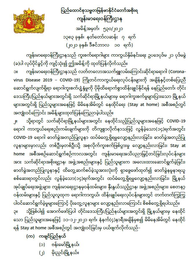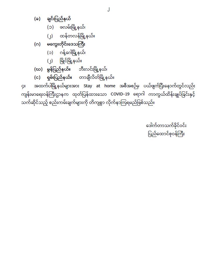 ဗန်းမော်၊ မိုးညှင်း၊ ဖလမ်း၊ ထန်တလန်၊ ဂန့်ဂေါ၊ မြိုင်၊ ဘီးလင်းနှင့် တာချီလိတ် မြို့နယ်တို့အား Stay at home အစီအစဉ်တွင် အကျုံးဝင်ခြင်းမှ ပယ်ဖျက်