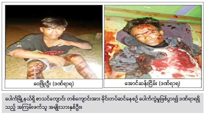 ထိုသို့စေခိုင်းလျက်ရှိရာ ဒီဇင်ဘာလ ၁၁ ရက် ည ၇ နာရီခွဲခန့်တွင် မကွေးတိုင်းဒေသကြီး၊ ပေါက်မြို့နယ်၊ ဆင်ဇာကျေးရွာရှိ အခြေခံပညာ အထက်တန်းကျောင်း၌ ကလေးသူငယ်များ ပညာသင်ကြားလျက်ရှိစဉ် အဖျက်အမှောင့်ဆောင်ရွက်ရန်အတွက် ကျောင်းရှေ့ခြံစည်းရိုး အုတ်တံတိုင်းအနီး၌ ခင်တန်းရှည်ကျေးရွာနေ ဝေဖြိုးဦး (၁၇)နှစ် (ဘ) ဦးမျိုးသက် နှင့် ကူးကား ကျေးရွာနေ အောင်ဆန်းငြိမ်း(၁၆)နှစ် (ဘ) ဦးရဲမြင့် တို့ ၂ ဦးသည် လက်လုပ်မိုင်းထောင်နေစဉ် ပေါက်ကွဲမှု ဖြစ်ပွားခဲ့ကြောင်း သတင်းအရ လုံခြုံရေးတပ်ဖွဲ့ဝင်များက သွားရောက်စစ်ဆေးခဲ့ရာ ၎င်းတို့ ၂ ဦးတွင် မိုင်းစထိမှန်ဒဏ်ရာများရရှိခဲ့ပြီး အနီးမှ လက်လုပ်မိုင်း အပိုင်းအစများ တွေ့ရှိ သိမ်းဆည်းရမိခဲ့သည်။