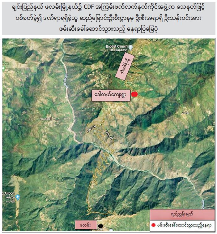 ဒီဇင်ဘာလ ၁၄ ရက်နေ့ မွန်းလွဲ ၂ နာရီအချိန်တွင် ချင်းပြည်နယ်၊ ဖလမ်းမြို့နယ်၊ ကျင်မွှာရပ်ကွက်၌ အမျိုးသား ၁ ဦးသေနတ်ဖြင့် ပစ်ခတ်ခံရကြောင်း သတင်းအရ လုံခြုံရေးတပ်ဖွဲ့ဝင် များပါဝင်သော ပူးပေါင်းအဖွဲ့က သွားရောက်စစ်ဆေးခဲ့ရာ ကျင်မွှာရပ်ကွက်၊ ကလေး-ဖလမ်းကားလမ်း ဘေးရှိ “ထီးရိပ်ဆိုင်ခွဲ(၂)”လက်ဖက်ရည်ဆိုင်၌ ဖလမ်းမြို့ဆည်မြောင်းဦးစီးဌာနမှ ဦးစီးအရာရှိ ဦးသန်းဝင်း (၅၇)နှစ် (ဘ)ဦးမြသောင်းသည် ၎င်း၏မိတ်ဆွေ ၁ ဦးနှင့်အတူ လက်ဖက်ရည်သောက်နေစဉ် CDF အကြမ်းဖက်လက်နက်ကိုင် ၂ ဦးသည် ပစ္စတိုသေနတ်ကိုယ်စီ ကိုင်ဆောင်ရောက်ရှိလာပြီး ဦးသန်းဝင်း အား သေနတ်ဖြင့် ဝိုင်းဝန်းပစ်ခတ်ကာ ဦးသန်းဝင်းပိုင် 2F/6226 SURF မော်တော်ယာဉ်အား ယူဆောင်မောင်းနှင်ထွက်ပြေးသွားခဲ့ကြောင်း တွေ့ရှိရပါသည်။